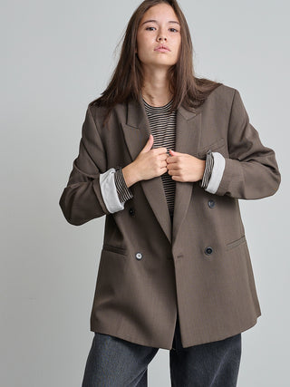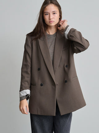 Blazer van het Italiaanse merk Pomandère. 55% polyester, 45% scheerwol. Kleur: Sigar. Oversizede blazer met revers en de dubbele knoopsluiting aan de voorkant.