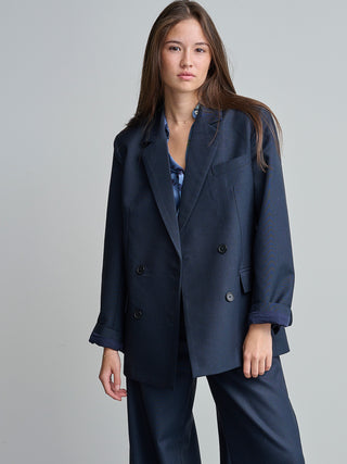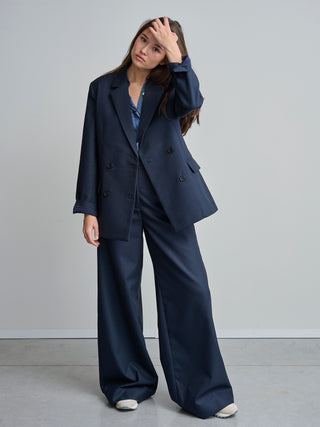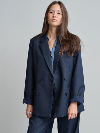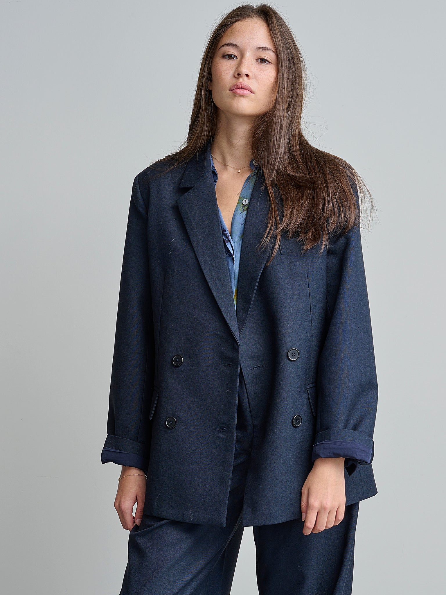 Blazer van het Belgische merk Mel. 70% polyester, 30% wol. Kleur: Nuit. Double breasted blazer.