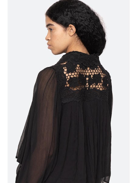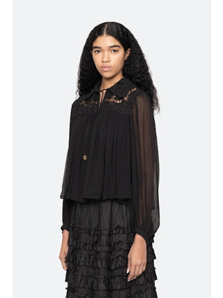Bloes van het Amerikaanse merk Sea NY. 100% katoen. Kleur: Zwart. Bloes met strik aan de voorkant, kwastjes en lange, volumineuze mouwen. Met delicate kanten accenten en een soepelvallend silhouet.