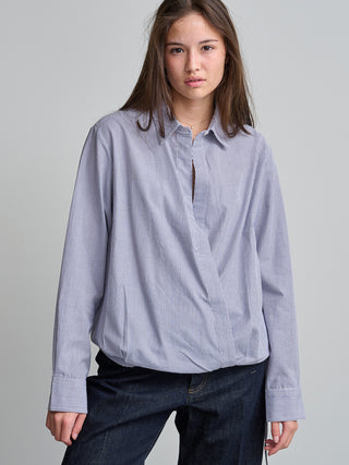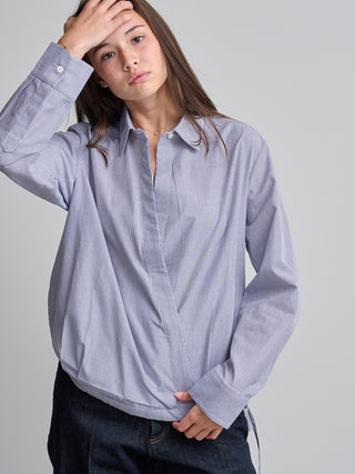 Bloes van het Belgische merk Mel. 100% katoen. Kleur: Blue. Gestreepte cache coeur bloes met verstelbare tailleband.