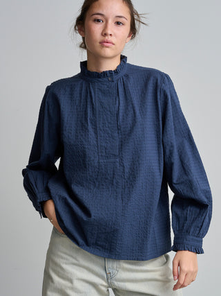 Bloes van het Franse merk Bellepièce. 100% katoen. Kleur: Night. Bloes met opstaand ruffle-kraagje.