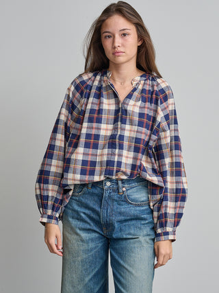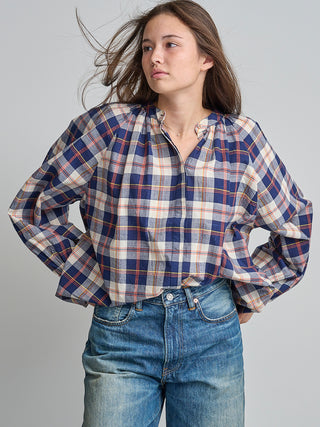 Bloes van het Franse merk Bellepièce. 100% katoen. Kleur: Navy. Geruite wijde bloes met raglanmouwen.