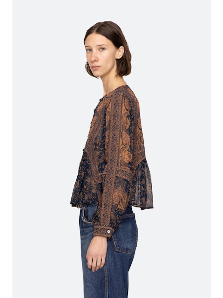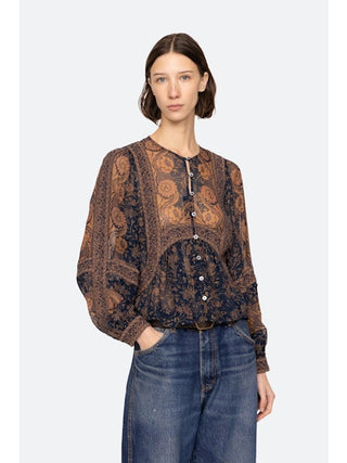 Bloes van het Amerikaanse merk Sea NY. 100% viscose. Kleur: Blue. Top met vintage-geïnspireerde bloemenprint en een opvallende randprint, afgewerkt met volumineuze pofmouwen en een verfijnde knoopsluiting aan de voorkant.