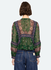 Bloes van het Amerikaanse merk Sea NY. 100% viscose. Kleur: Green. Top met vintage-geïnspireerde bloemenprint en een opvallende randprint, afgewerkt met volumineuze pofmouwen en een verfijnde knoopsluiting aan de voorkant.