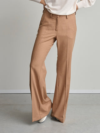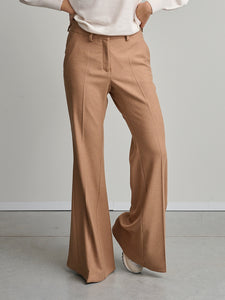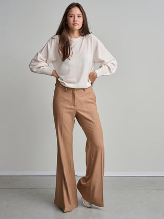 Broek van het Italiaanse merk Alysi. 33% viscose, 33% wol, 1% elastaan, 33% polyester. Kleur: Zand. Broek met wijd uitlopende pijpen.