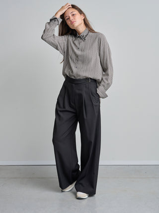 Broek van het Italiaanse merk Pomandère. 55% polyester, 45% wol. kleur: Zwart. Wijd uitlopende broek met dubbele plooi en riem op de zijkant.