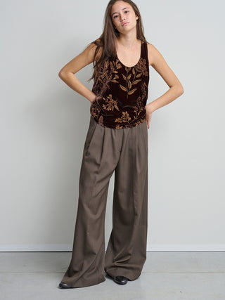 Broek van het Italiaanse merk Pomandère. 55% polyester, 45% wol. kleur: Sigar. Wijd uitlopende broek met dubbele plooi en riem op de zijkant.