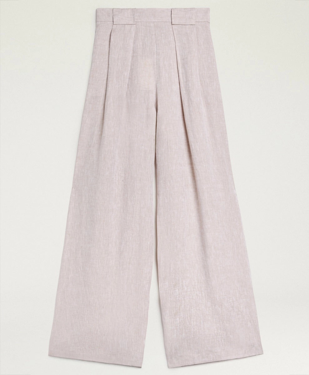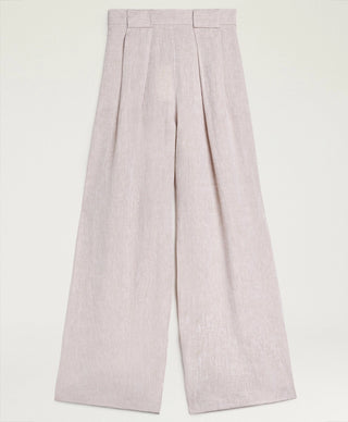 Broek van het Italiaanse merk Momoni. 100% linnen. Kleur: Beige. Een wijde, luchtige palazzo-broek met plooien aan de voorkant en extra brede riemlussen. Zijzakken in de naad en een elastische tailleband aan de achterkant.