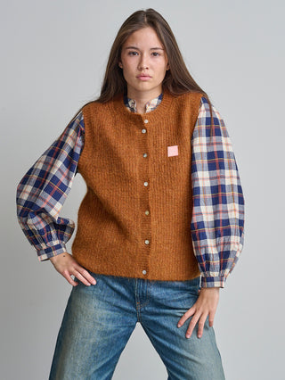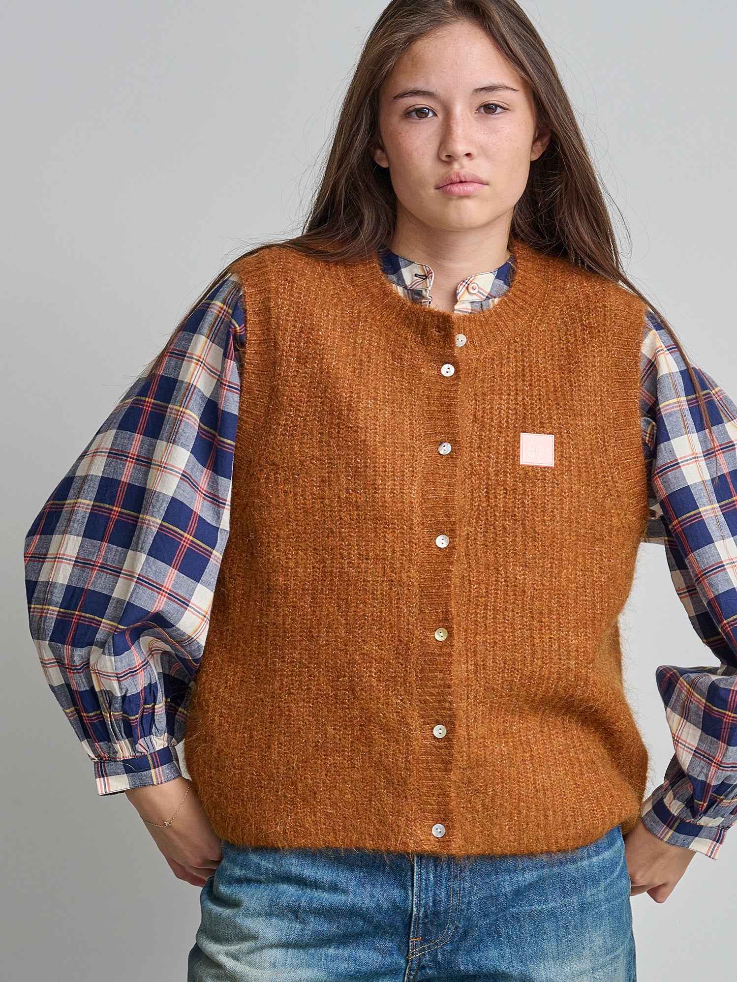Cardigan van het Franse merk American Vintage. 35% acrylic, 31% alpaca, 22% polyamide, 11% wol, 1% elastaan. Kleur: Eekhoorn. Mouwloos gilet met knoopjes.