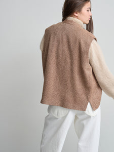 Jas van het Italiaanse merk Alysi. 100% wol. Kleur: Biscuit. Mouwloos jasje met enkele knoopsluiting.