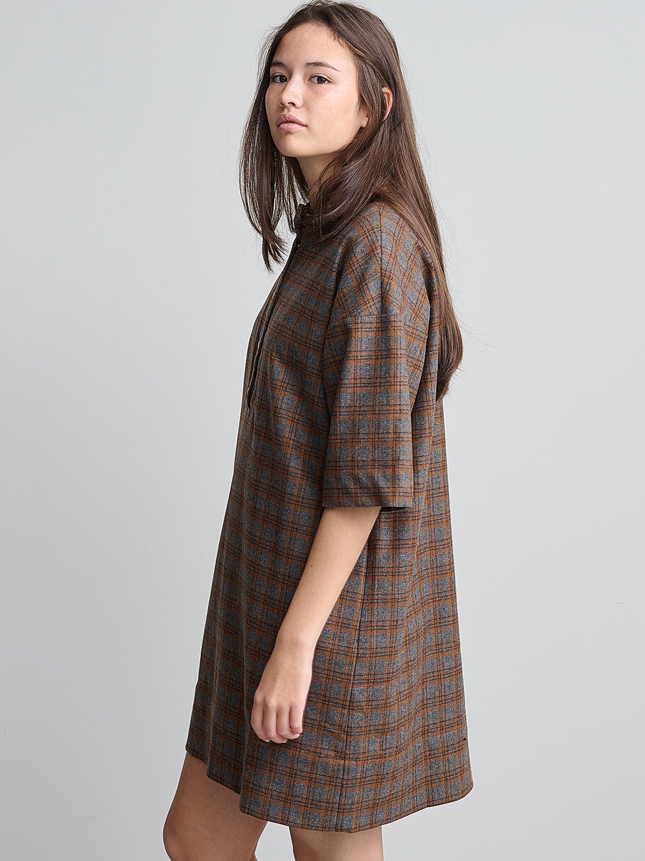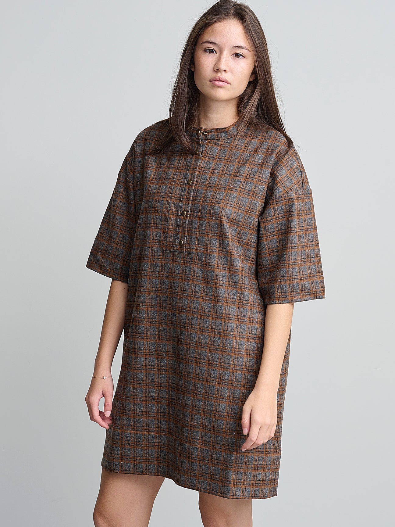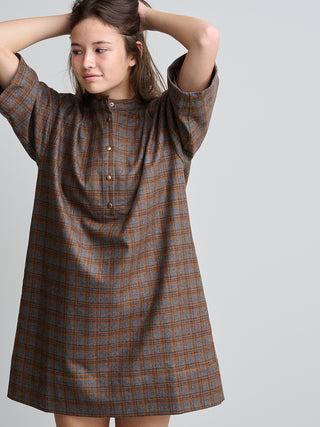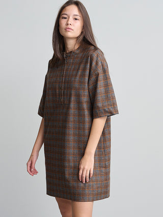 Jurk van het Franse merk Bellepièce. 69% wol, 25% polyamide, 5% andere, 1% elastaan. Kleur: Nuts. Mini jurk met korte mouwen, knoopsluiting aan de voorkant met drukknopen en zijzakken.