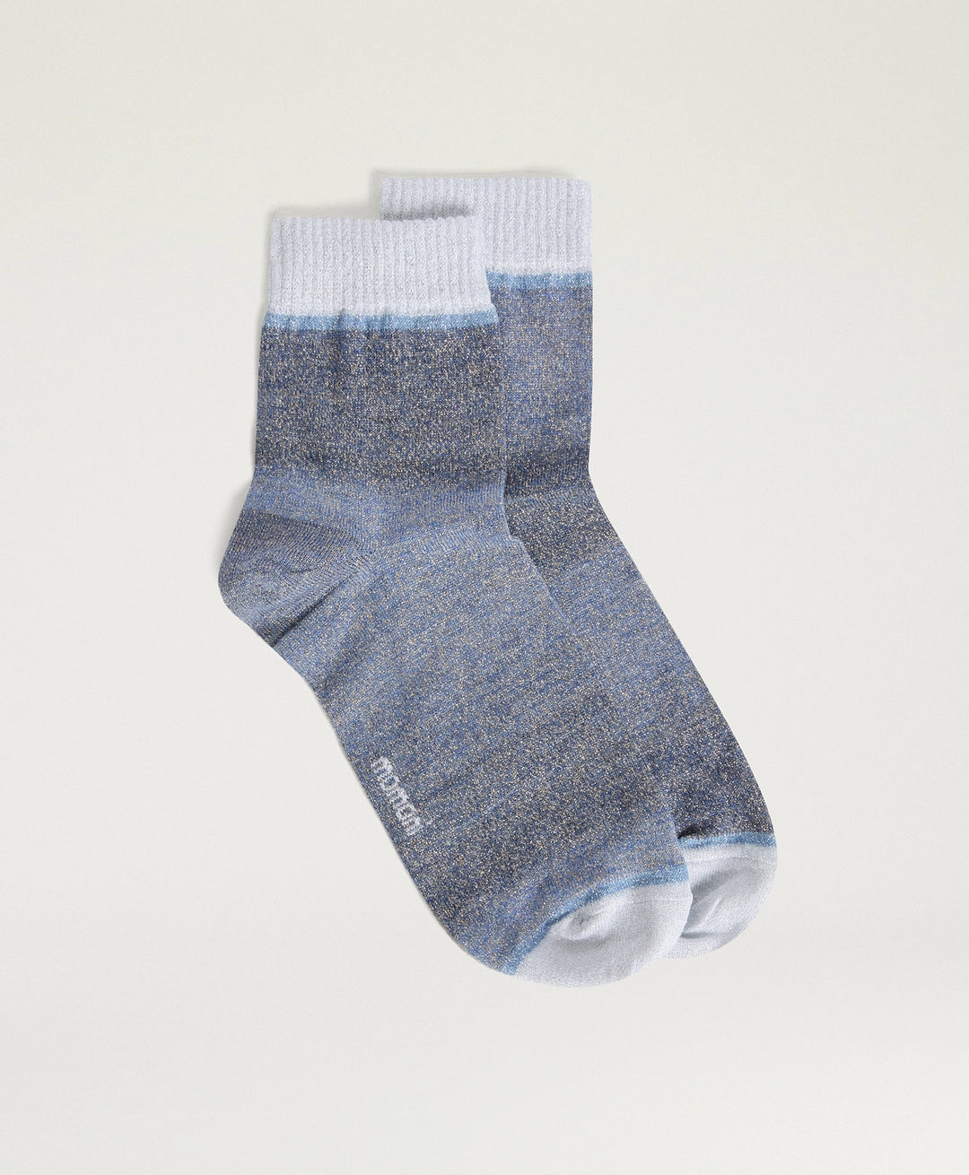 Kousen van het Italiaanse merk Momoni. 55% viscose, 28% polyamide, 10% polyester, 5% katoen, 2% elastaan. Kleur: Sky Blue. Sokken van veelkleurig gemêleerd lurexgaren met lurexgaren in een contrasterende kleur.