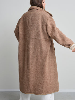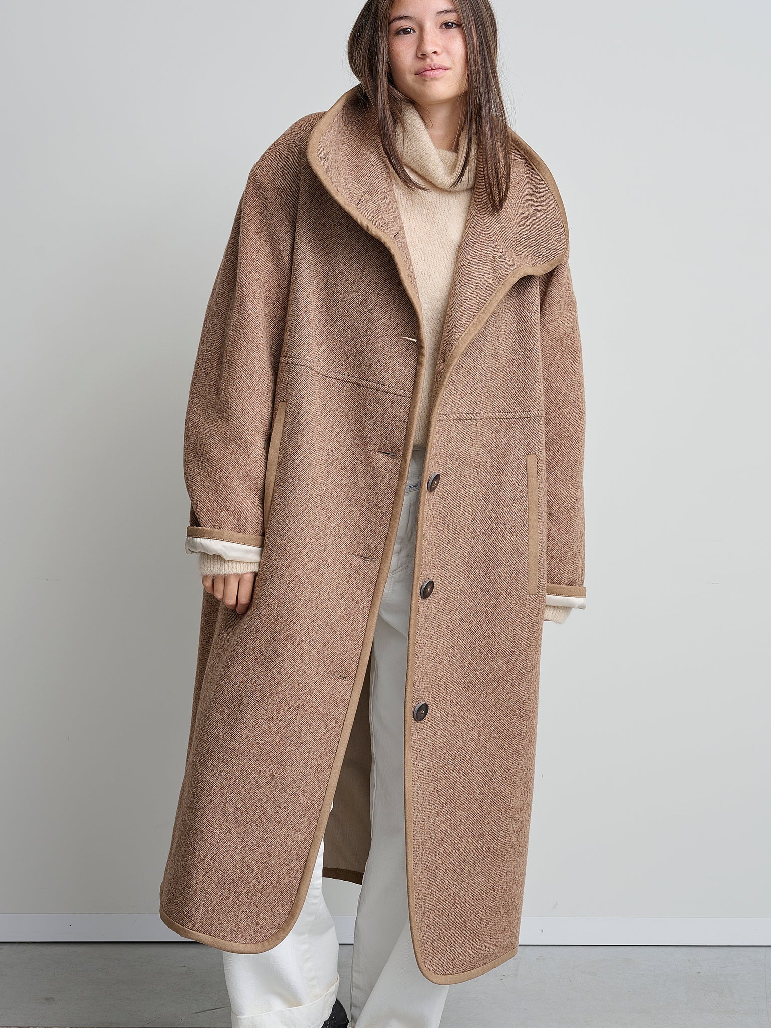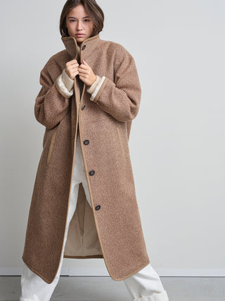 Mantel van het Italiaanse merk Alysi. 100% wol. Kleur: Biscuit. Lange rechte mantel met knoopsluiting en opstaande kraag.