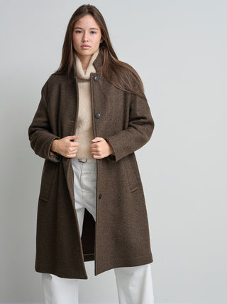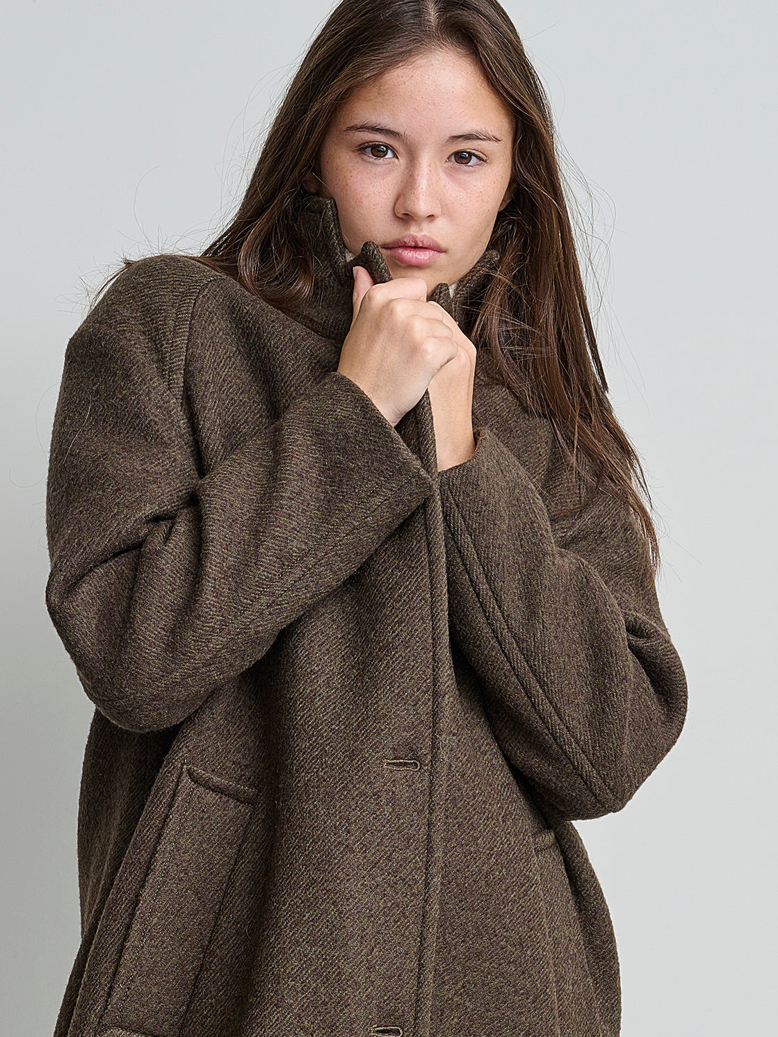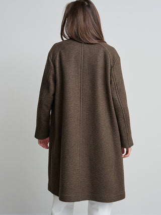 Mantel van het Italiaanse merk Pomandère. 40% katoen, 40% scheerwol, 14% polyester, 6% andere. Kleur: Khaki. Dubbelgeweven jas van wol en katoen.