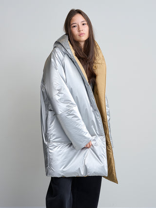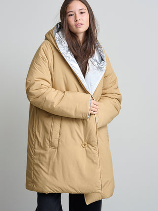 Mantel van het Italiaanse merk Oof Wear. 100% polyester. Kleur: Zilver/Zand. Omkeerbare midlengte mantel met kap gemaakt van waterafstotend shape memory nylon.