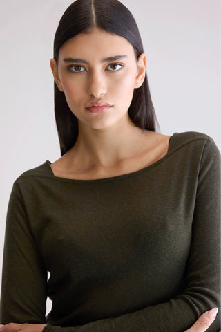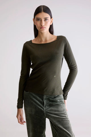 T-shirt van het Belgische merk Bellerose. 70% lyocel, 30% wol. Kleur: Forest. T-shirt met lange mouwen en boothals.