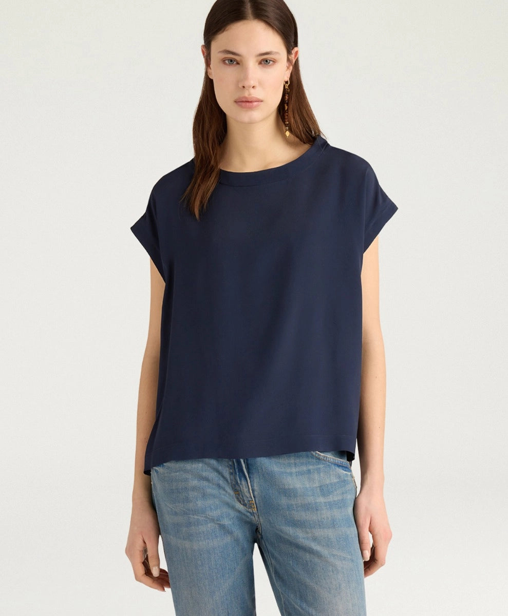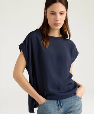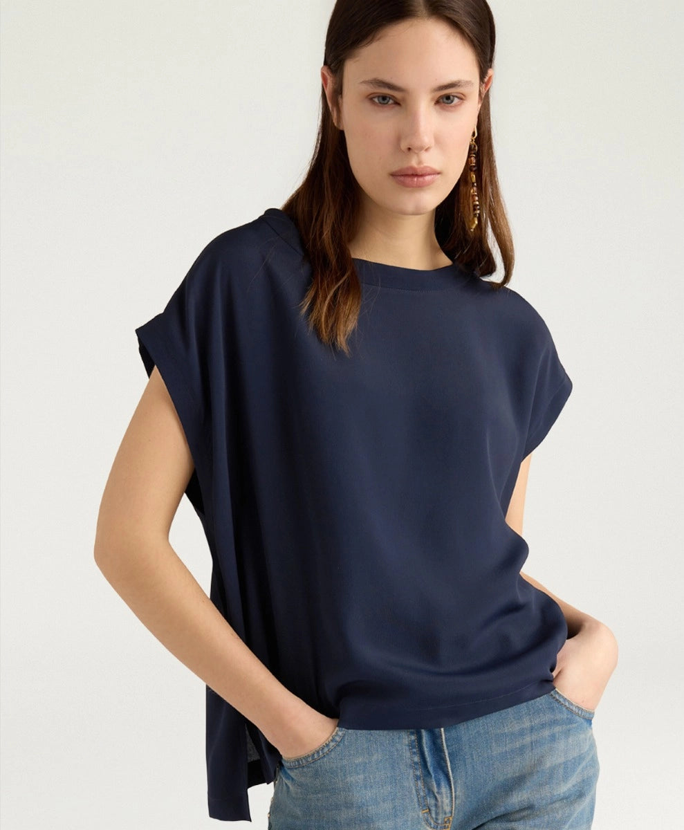 Top van het Italiaanse merk Momoni. 82% acetaat, 18% zijde. Kleur: Blu. Mouwloze bloes met boothals.