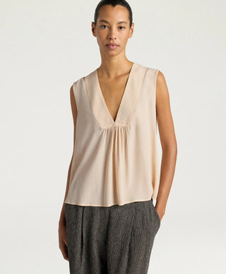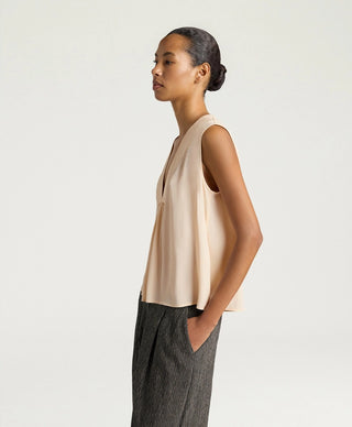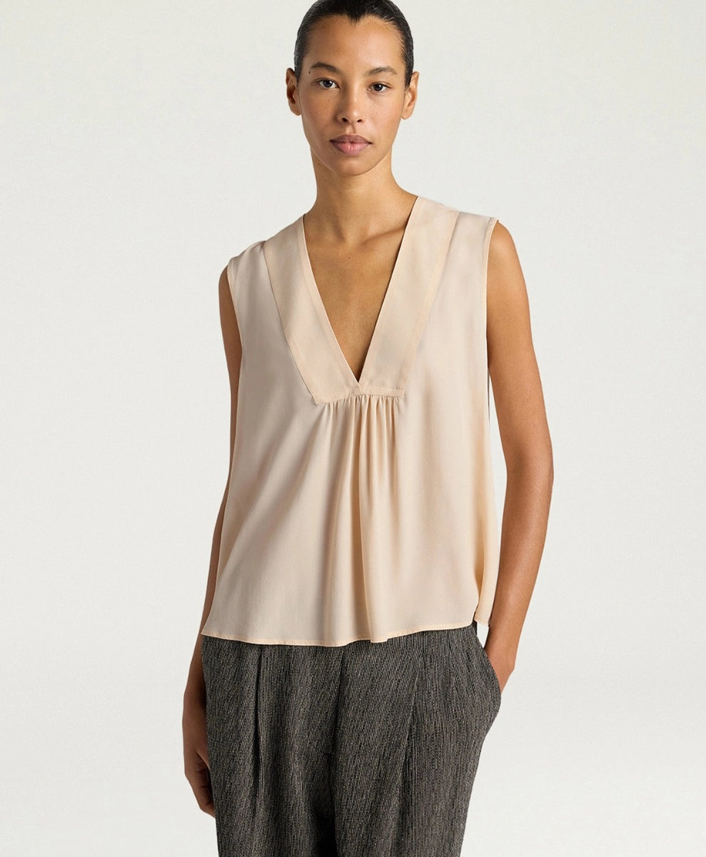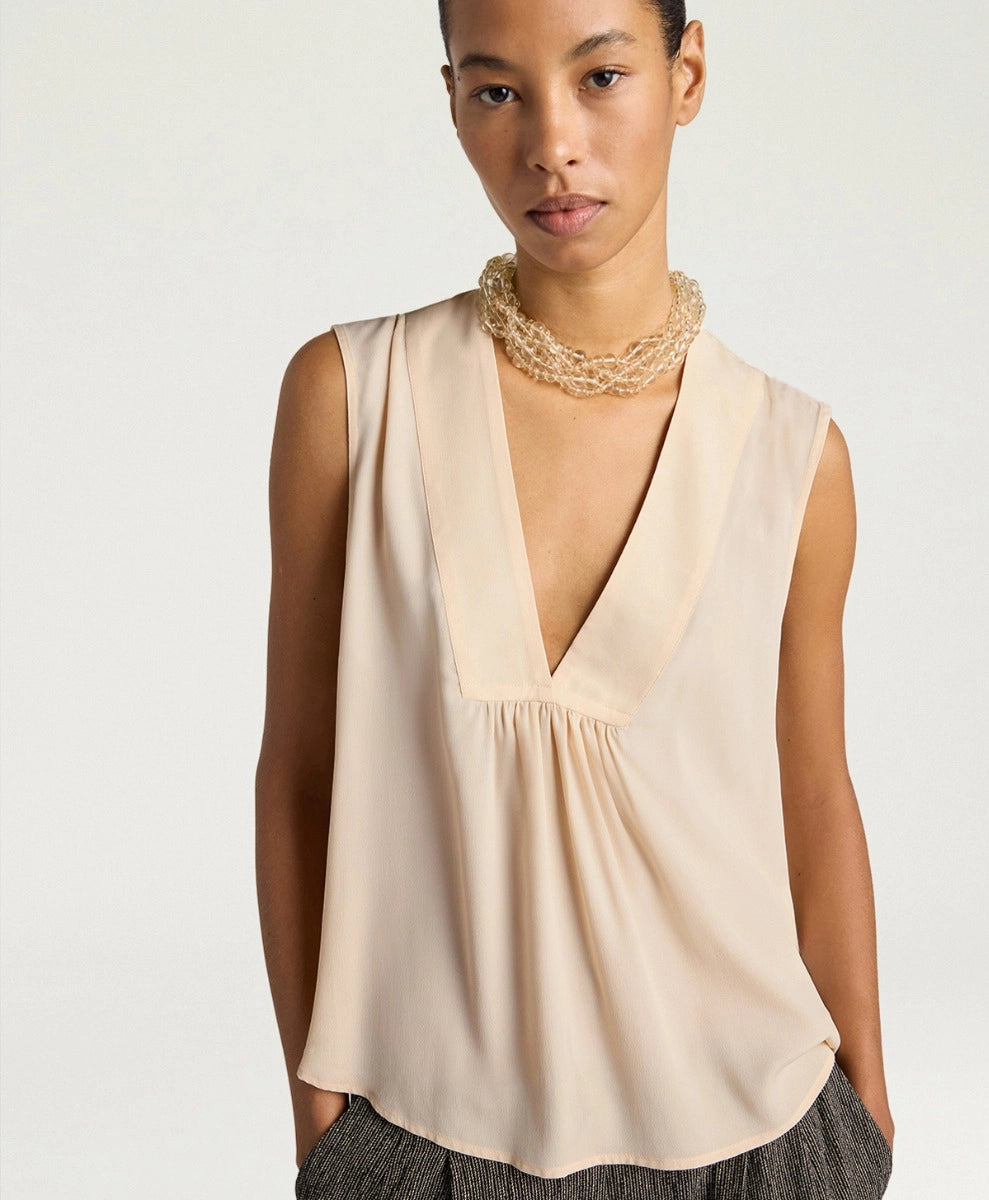 Top van het Italiaanse merk Momoni. 82% acetaat, 18% zijde. Mouwloze blouse van luchtige, effen crêpe van acetaat en zijde. Het model Juana heeft een ruim silhouet en een V-hals met een gerimpelde band aan de voorkant.