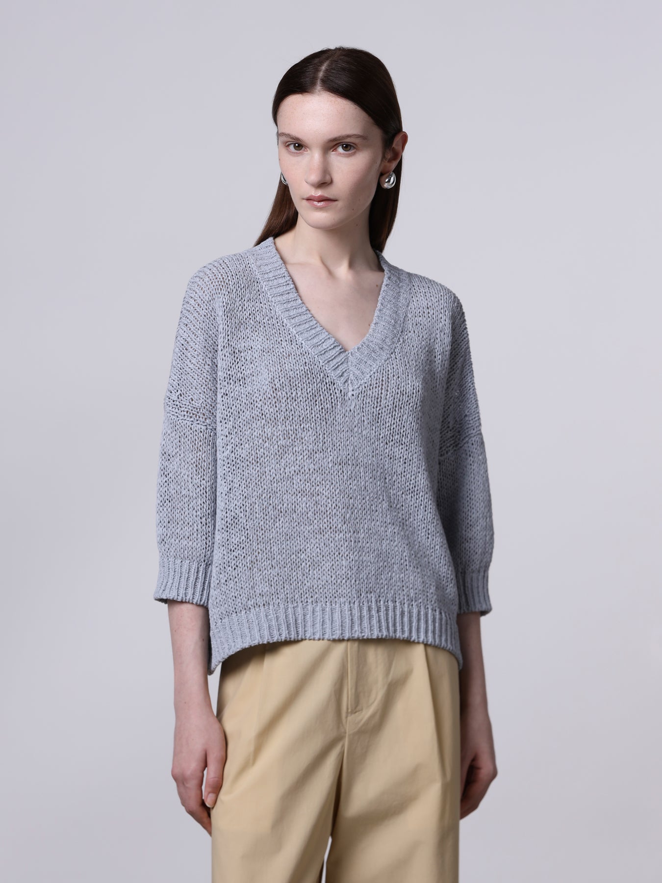 Trui van het Italiaanse merk Roberto Collina. 66% katoen, 34% polyamide. Kleur: Ice. Een boxy trui met relaxte pasvorm, gemaakt van een katoenmix. De trui heeft korte mouwen, verlaagde schouders, een diepe V-halslijn en geribde boorden aan de zoom en manchetten.