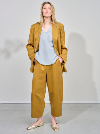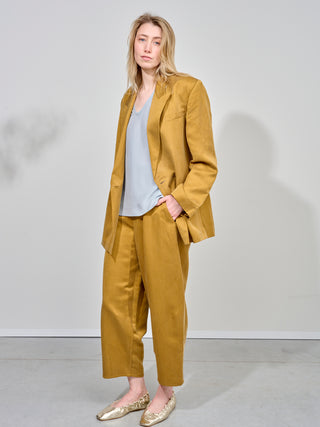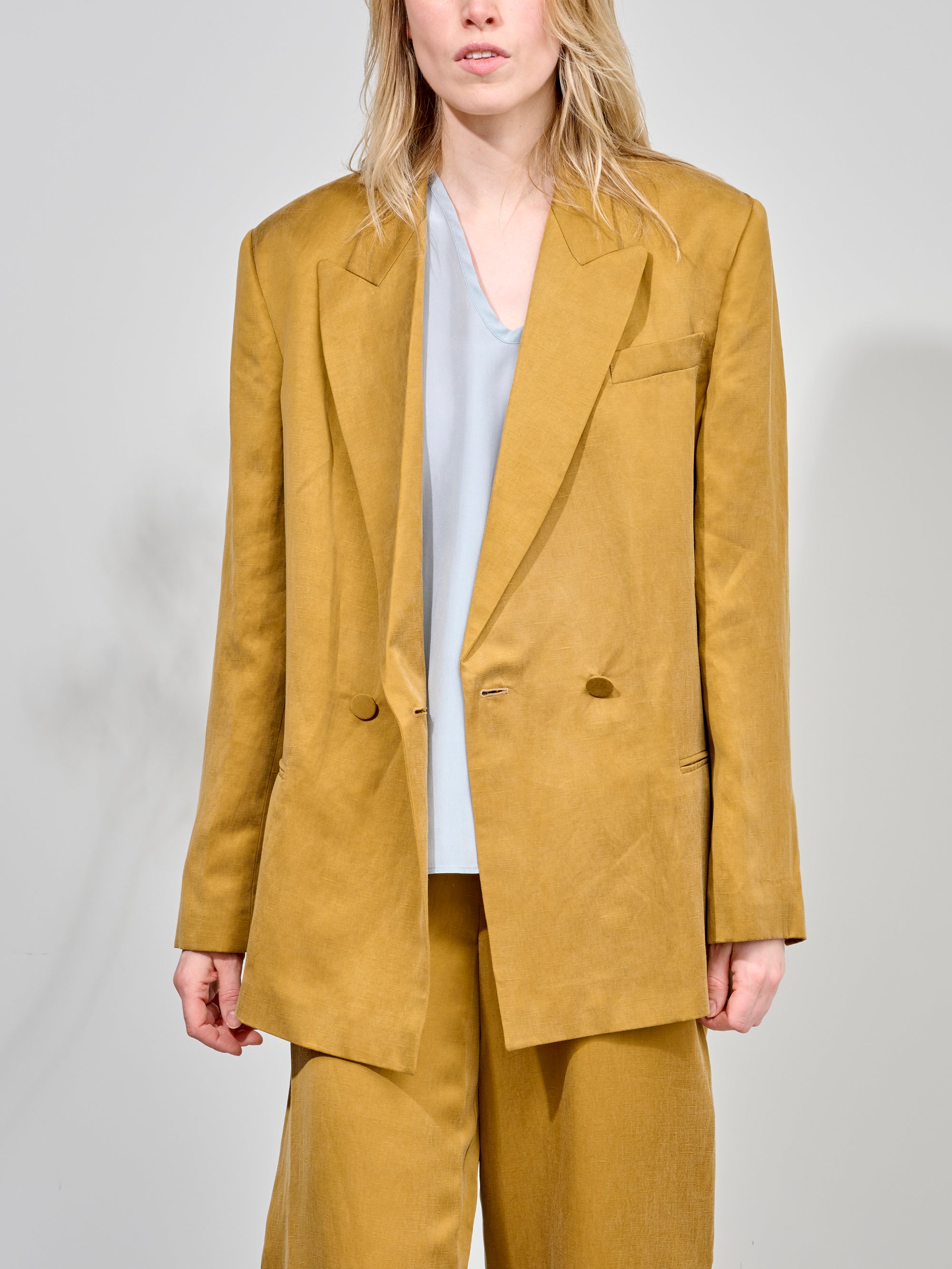 Blazer van het Italiaanse merk Alysi. 63% lyocel, 37% linnen. Kleur: Olio. Oversized blazer met dubbele knopenrij.