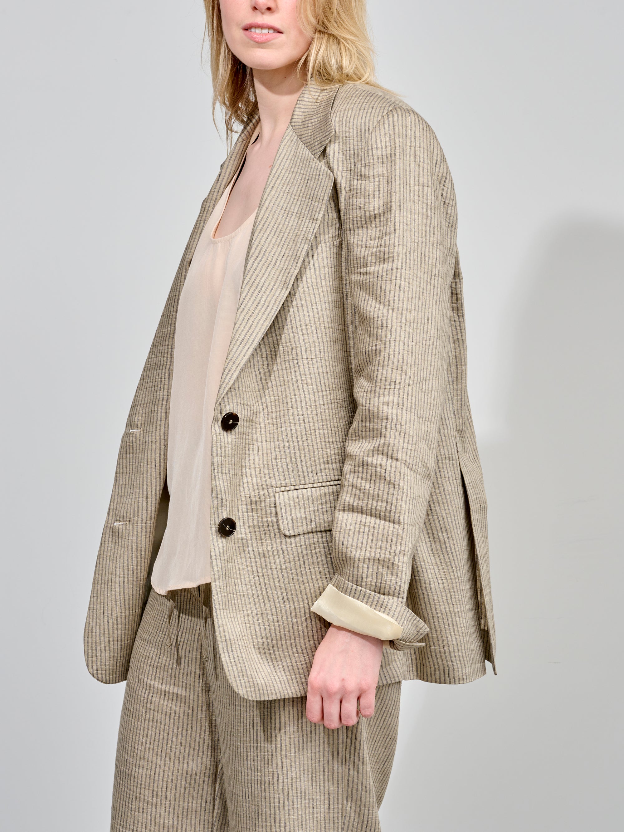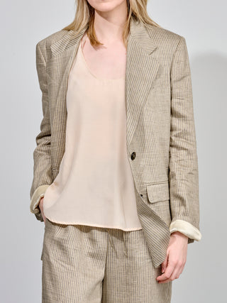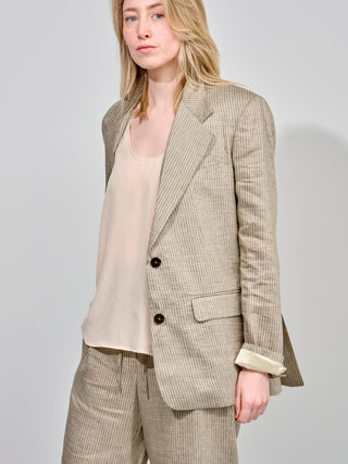 Blazer van het Italiaanse merk Alysi. 88% zijde, 12% polyamide. Kleur: Modder. Gestreepte blazer met enkele knopenrij.