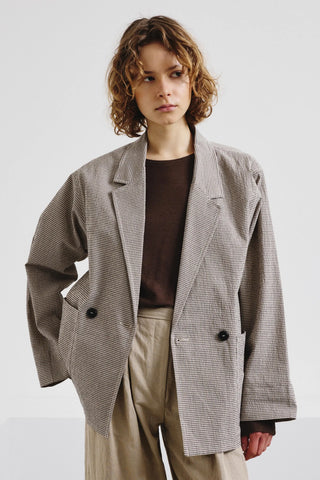 Blazer van het Italiaanse merk Pomandère. 99% katoen, 1% elastaan. Kleur: Lime White. Het lichtgewicht katoenen micro-vichy jasje geeft een frisse, eigentijdse elegantie aan het double-breasted model. Het kleine ruitjespatroon zorgt voor een verfijnde, stralende touch, terwijl de strakke constructie de veelzijdigheid ervan versterkt.