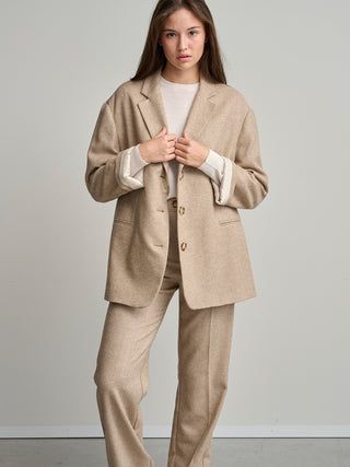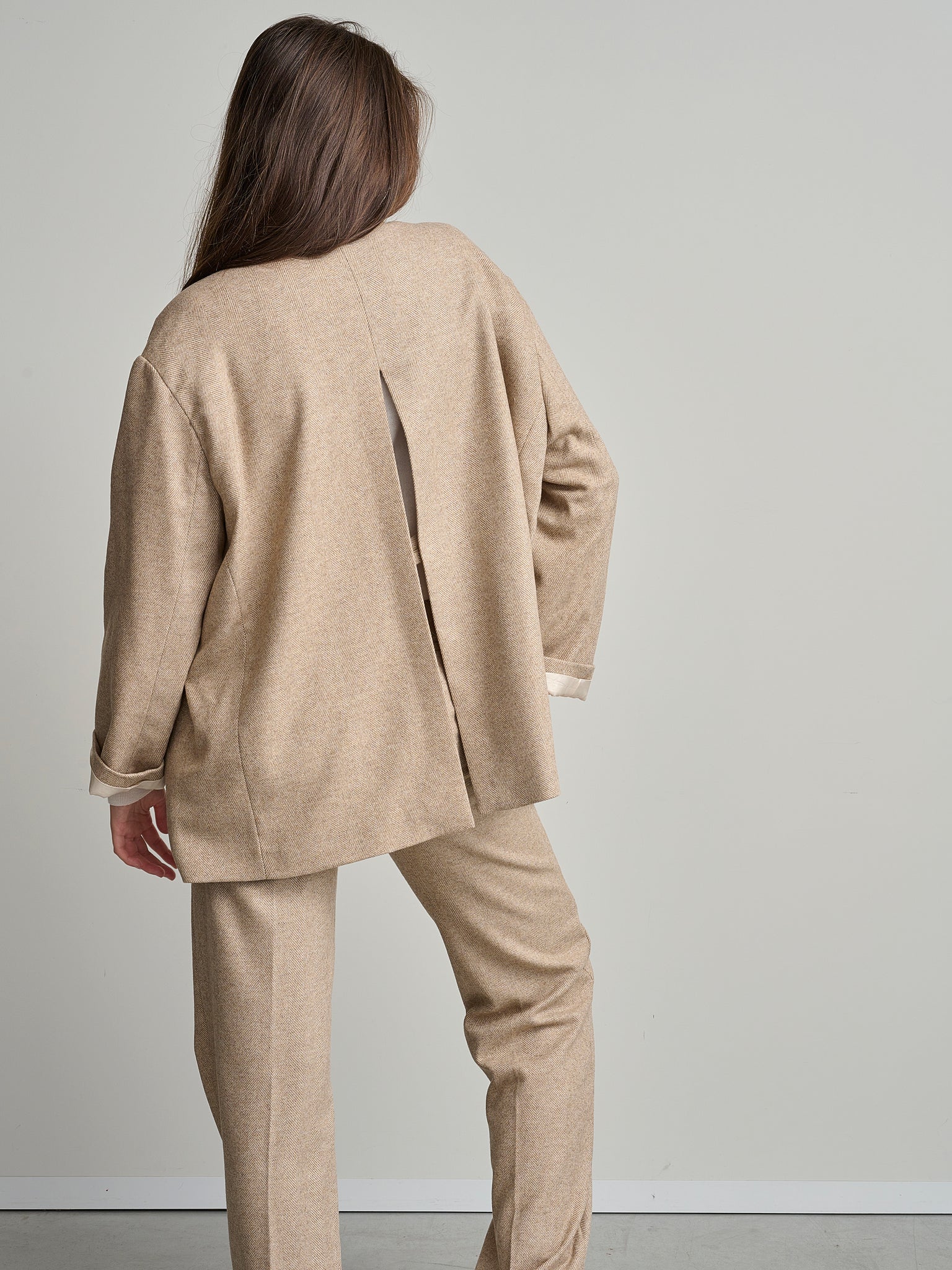 Blazer van het Italiaanse merk Momoni. 67% wol, 30% polyamide, 3% overige materialen. Kleur: Beige. Oversized jas van Italiaanse chevronwol met trenchcoat-achtige split aan de achterkant.
