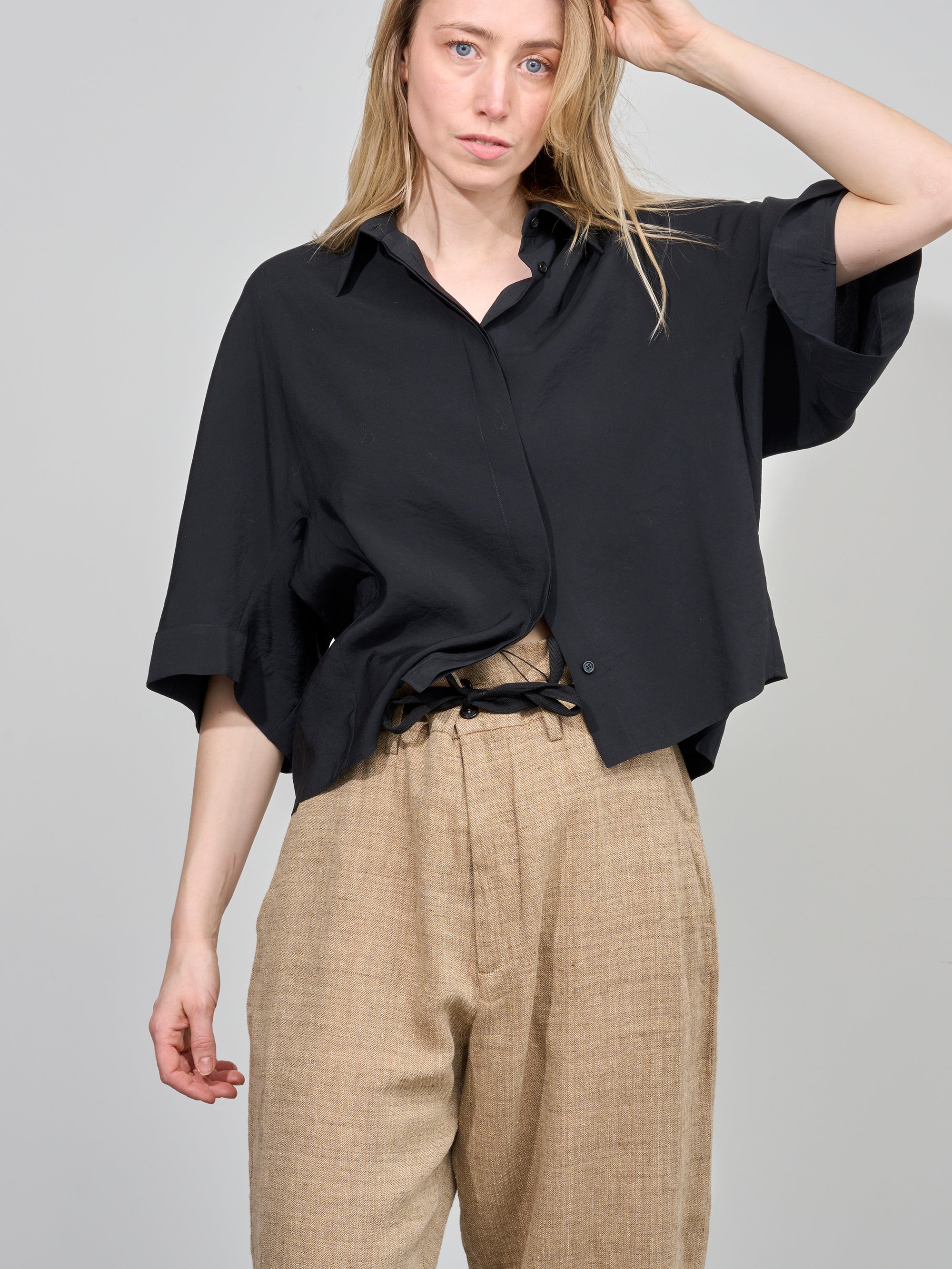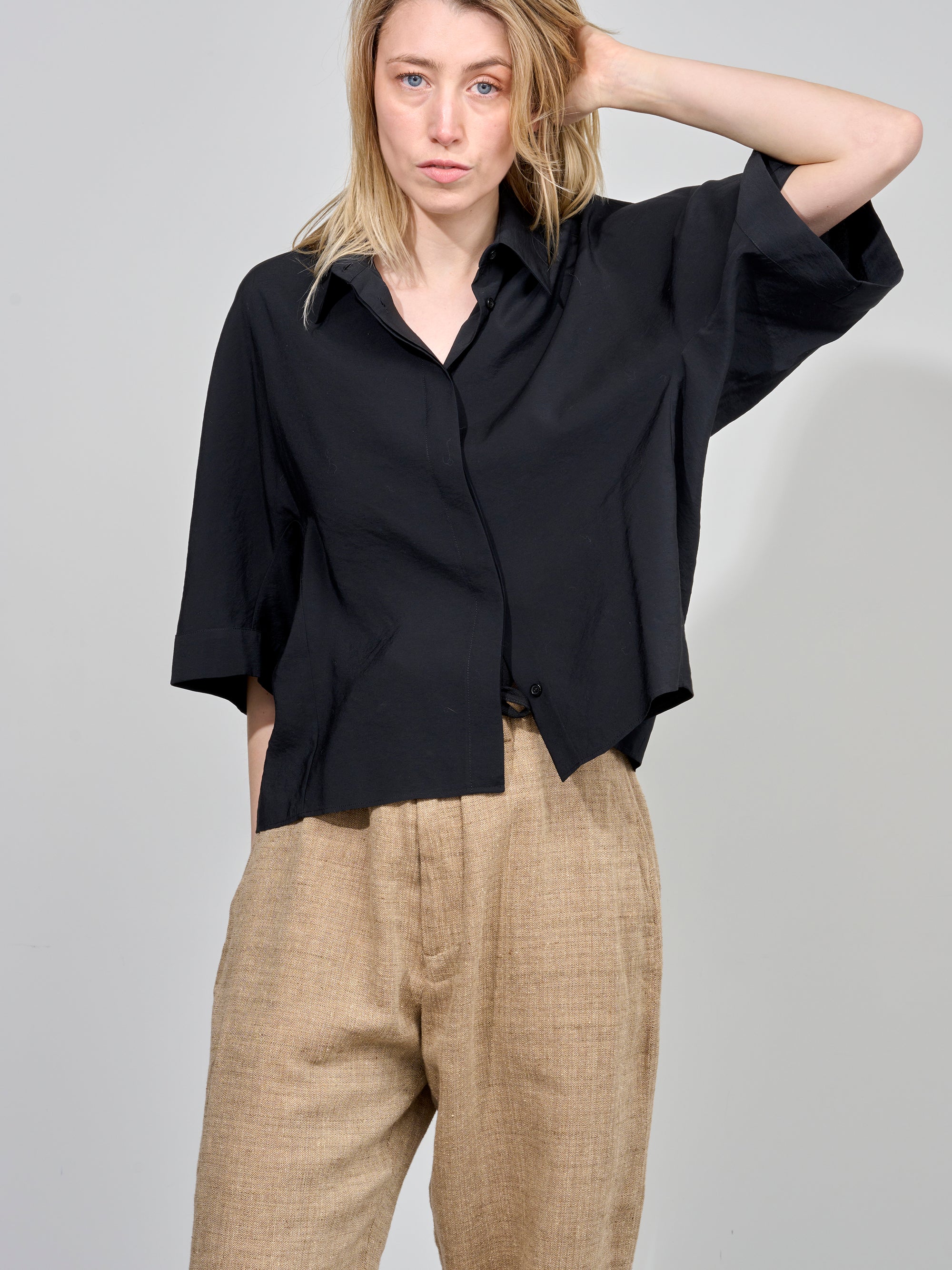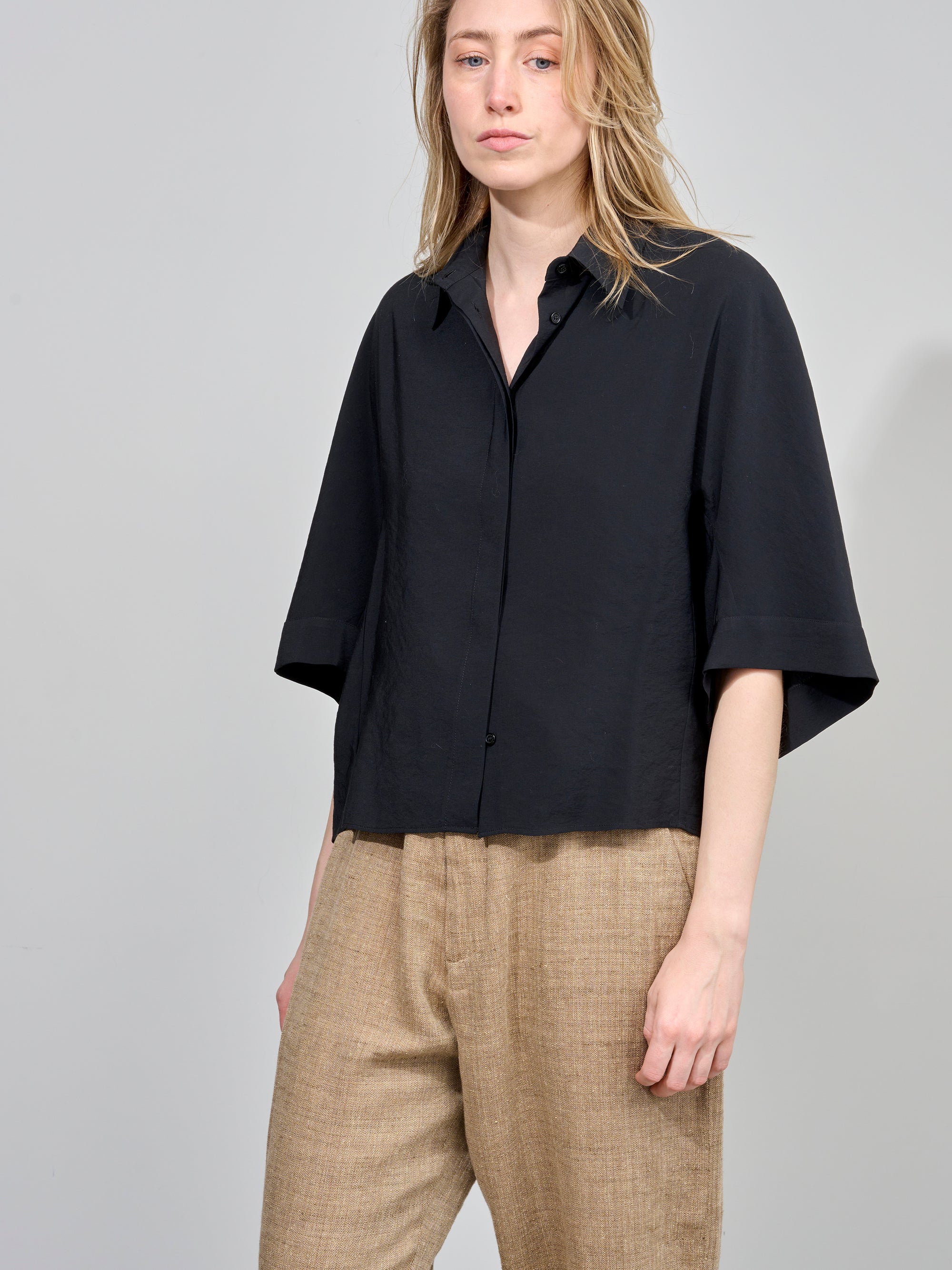 Bloes van het Italiaanse merk Alysi. 85% modal, 15% polyester. Kleur: Nero. Bloes met 3/4 mouwen.