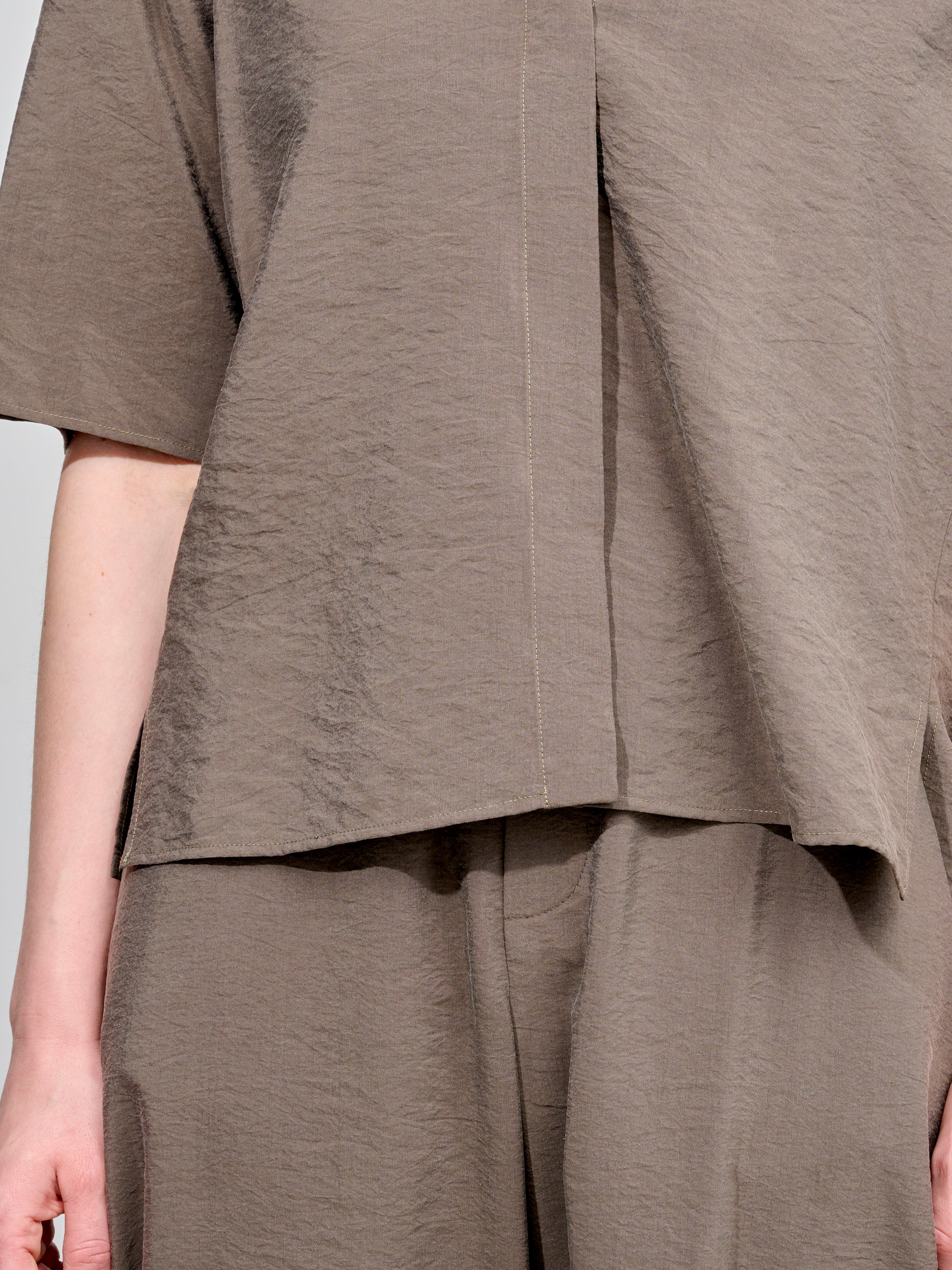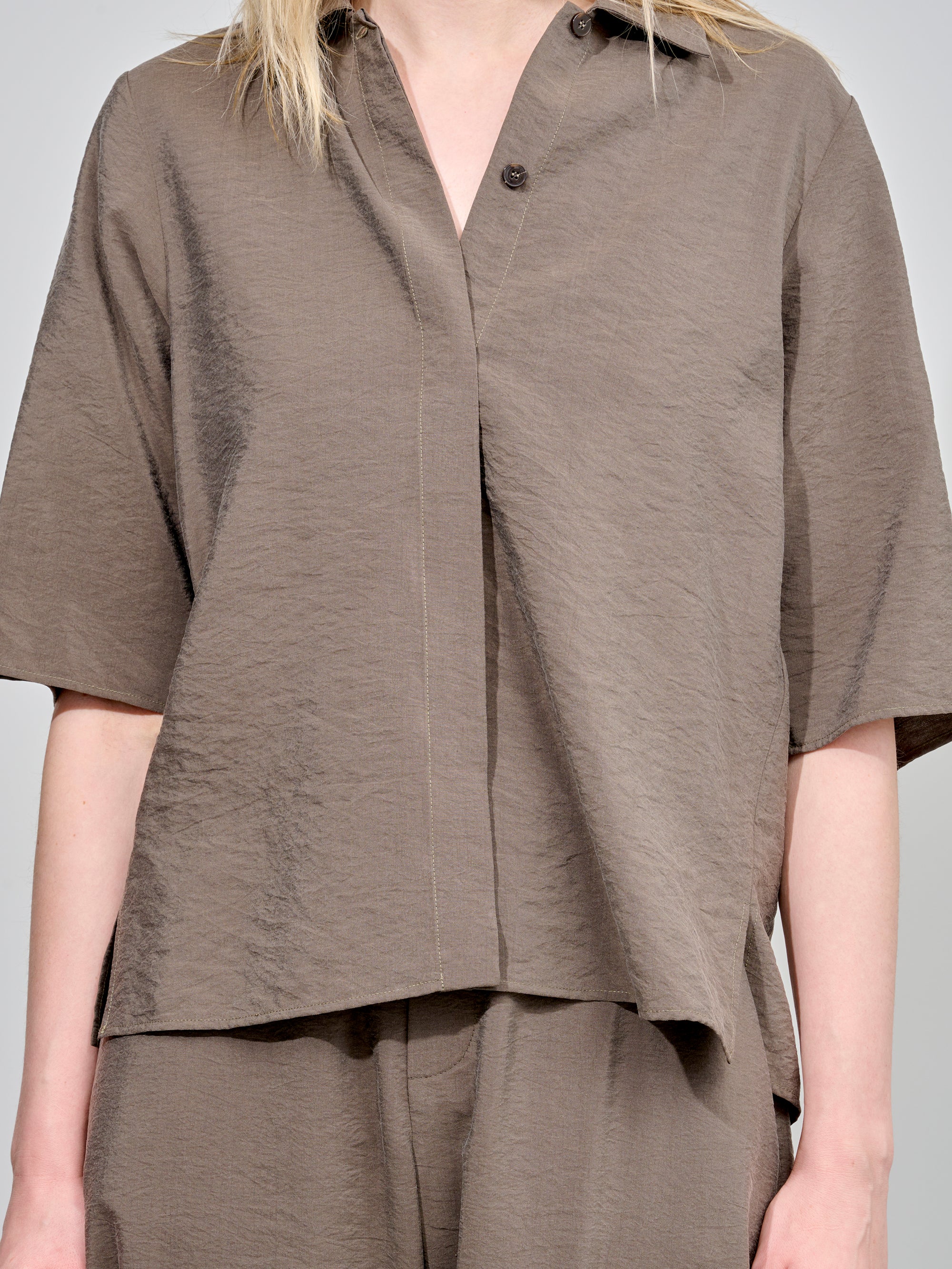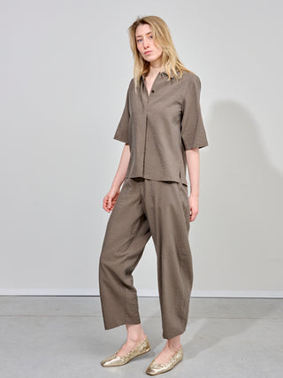 Bloes van het Italiaanse merk Alysi. 83% zijde, 17% polyamide. Kleur: Modder. Rechte bloes met halflange mouwen.