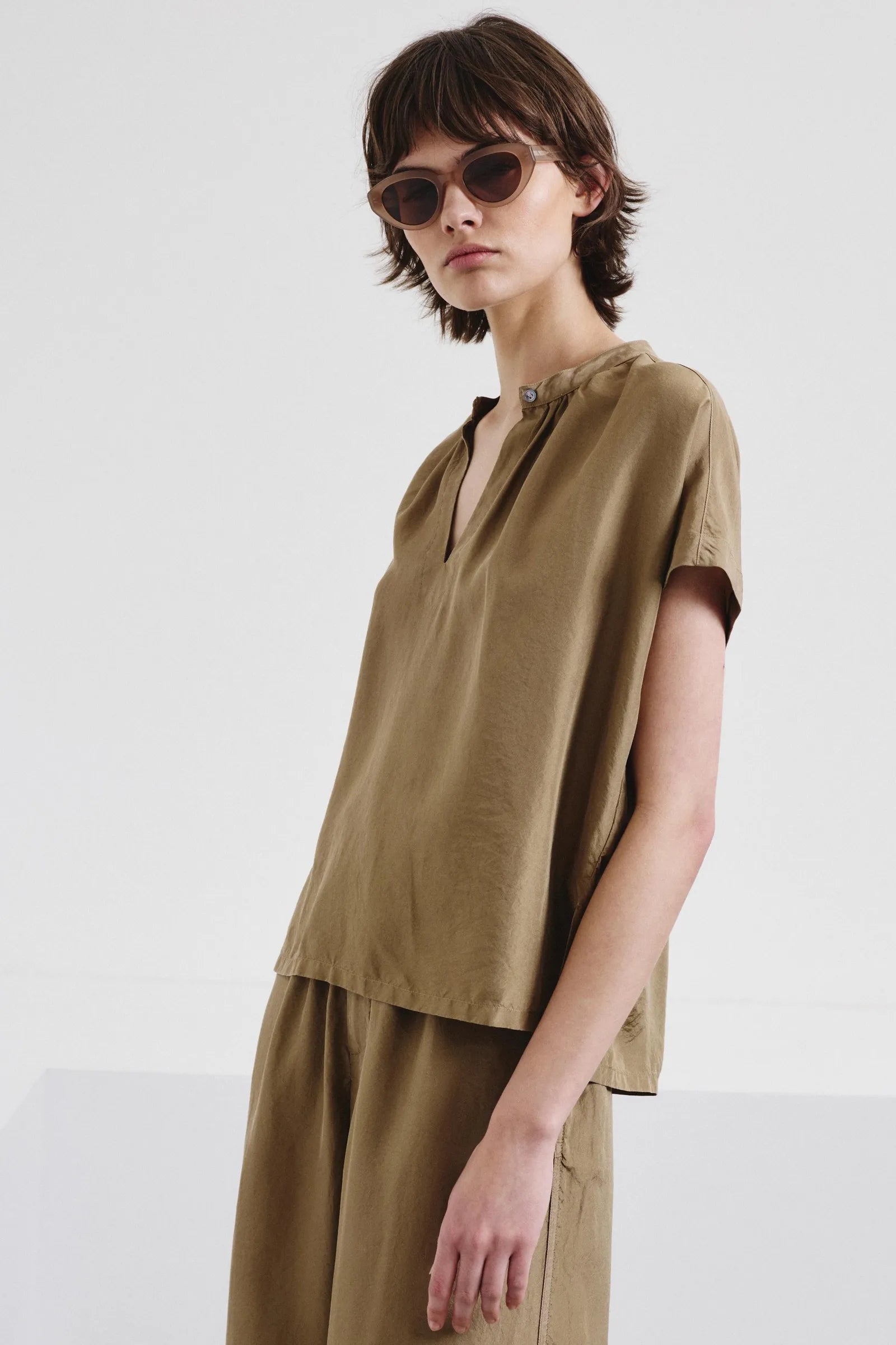 Bloes van het Italiaanse merk Pomandère. 100% zijde. Kleur: 270. Zijden top met korte mouwen en plooitjesdetail aan de achterzijde.
