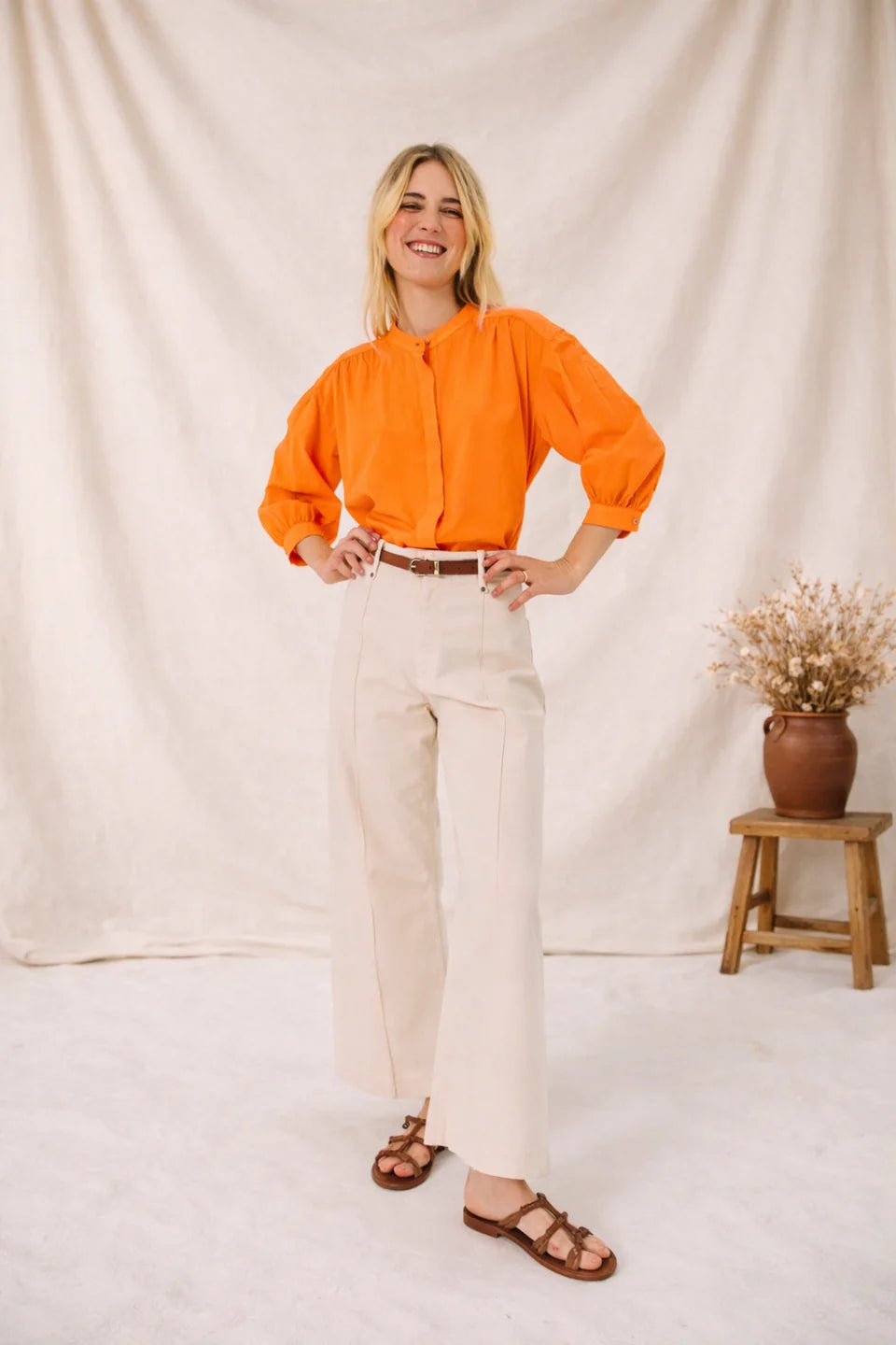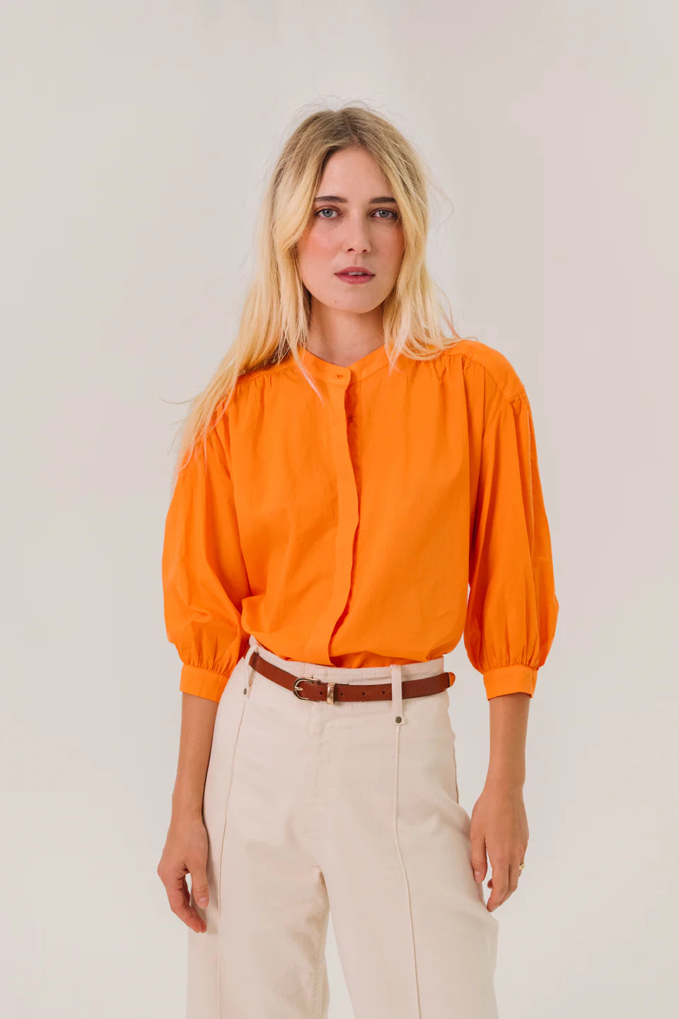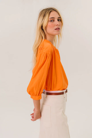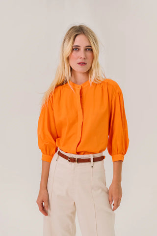 Bloes van het Franse merk Sacrécoeur. 100% katoen. Kleur: Aurora. Effen bloes met 3/4-mouwen van fijne katoenpopeline. Los, vrouwelijk model met plooitjes op de schouders, rug en manchetten. Maokraag en verborgen knoopsluiting voor een subtiele, elegante touch.