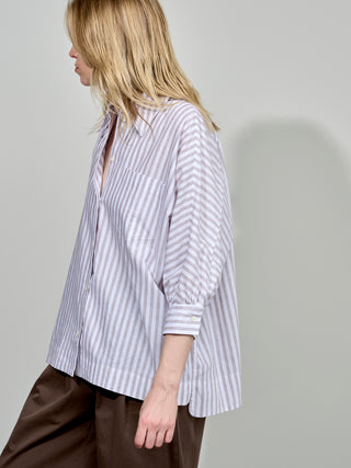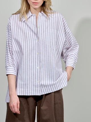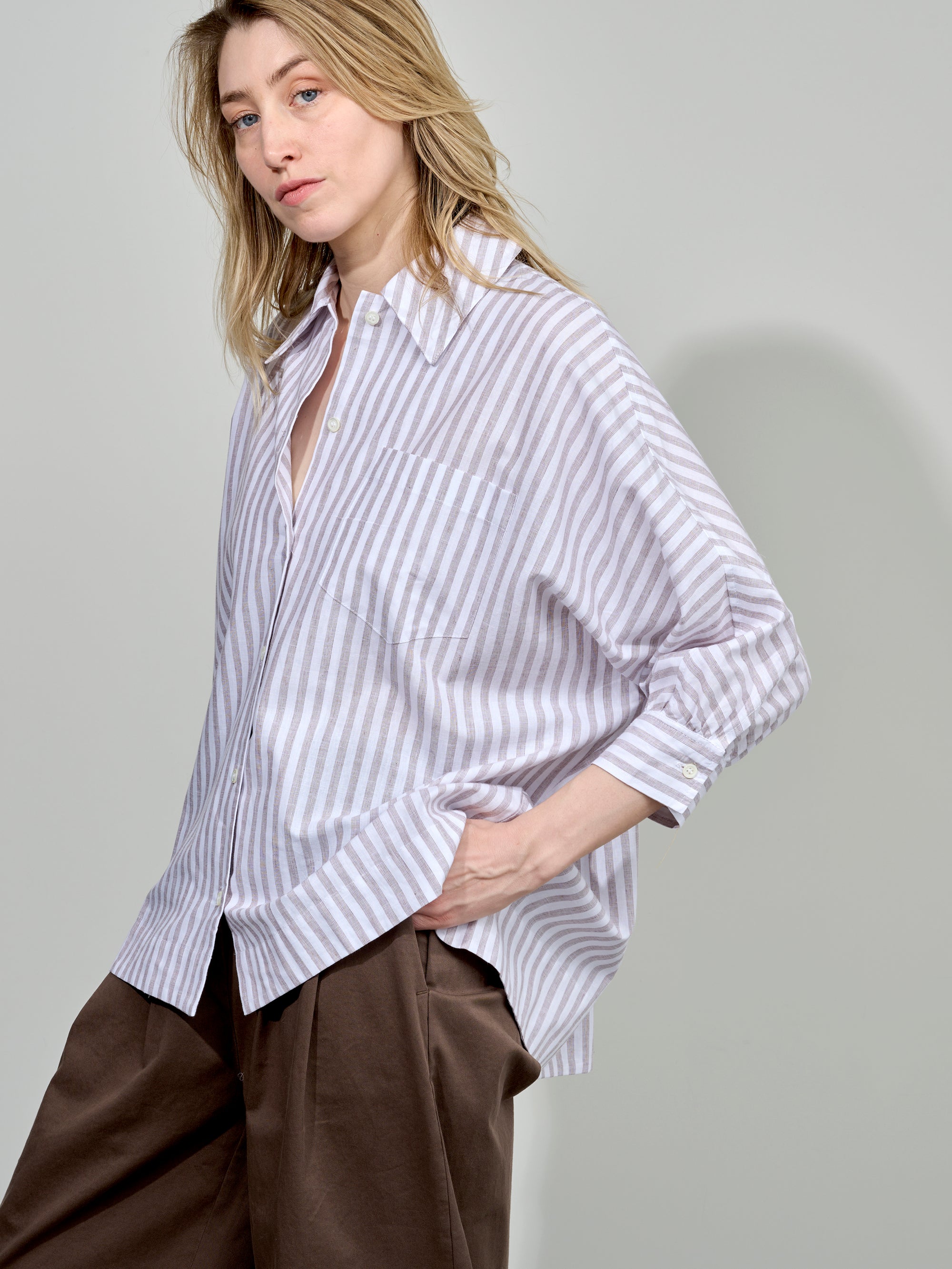 Bloes van het Belgische merk Shades. 70% katoen, 30% linnen. Kleur: Brown. Wijde bloes met halflange mouwen.