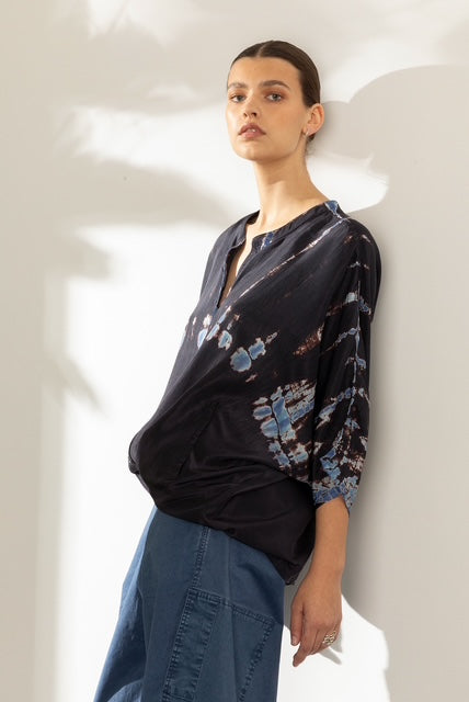 Jurk van het Belgische merk Mel Antwerp. 100% zijde. Kleur: Ink. Zijden bloes in tye dye print met halflange mouwen en steekzakken.