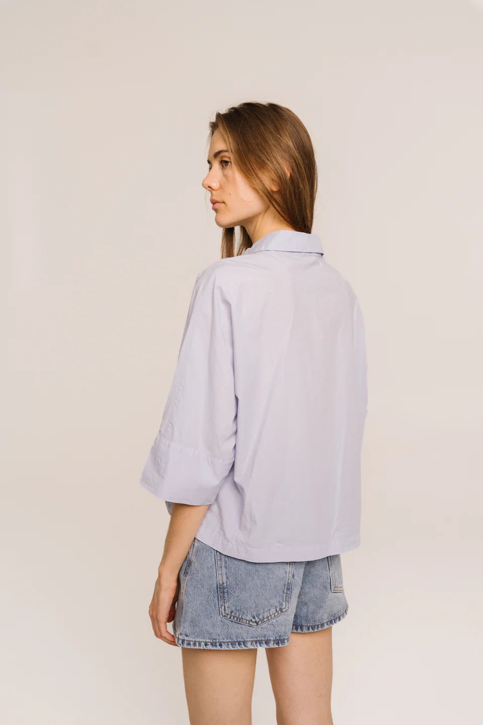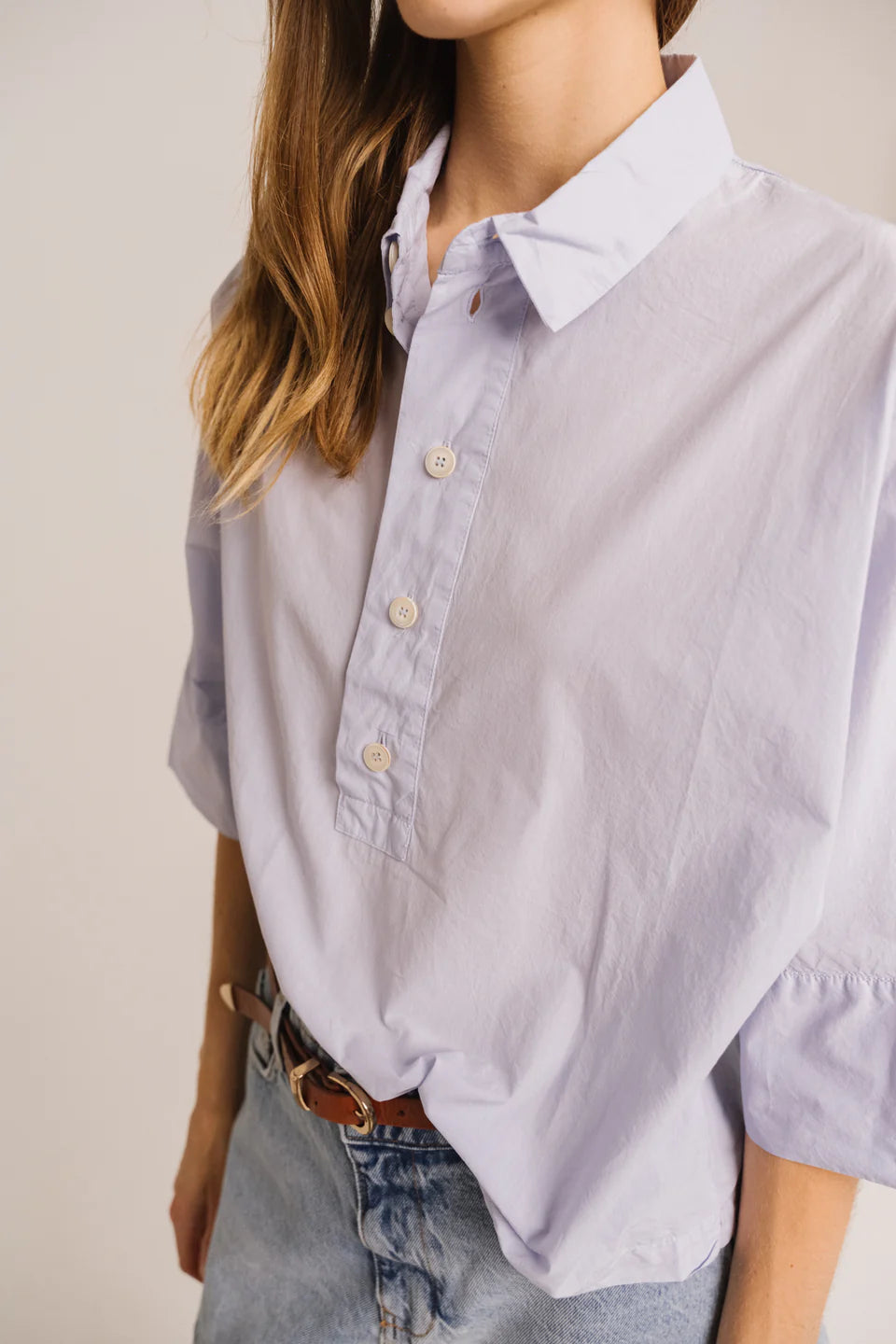 Bloes van het Franse merk Sacrécoeur. 100% katoen. Kleur: Nuage. Bloes met 3/4 mouwen van fijne katoenpopeline. Geïnspireerd op de zeemanshemd, onderscheidt hij zich door zijn overhemdkraag, brede poloknoopsluiting en zichtbare knopen. De kimonomouwen en brede zoom aan de manchetten zorgen voor comfort en een nonchalante elegantie.