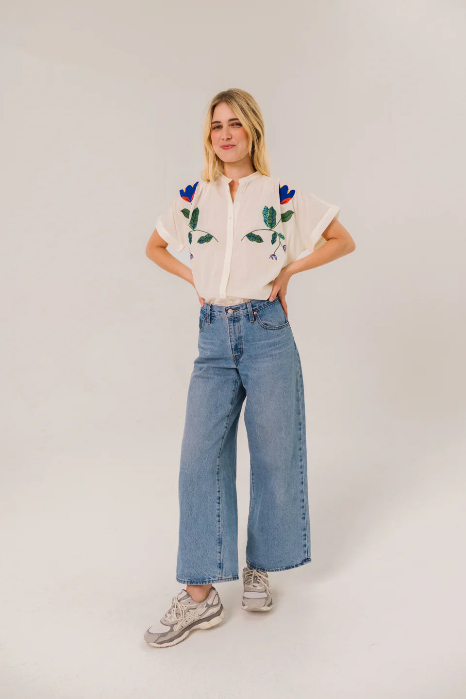 Bloes van het Franse merk Sacrécoeur. 100% katoen. Kleur: Corolle. Bloes met korte mouwen van katoenperkal, verfraaid met borduursels. De ruime en soepelvallende snit wordt geaccentueerd door plooien op de schouders en op de rug.