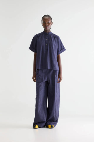 Bloes van het Belgische merk Bellerose. 84% viscose, 3% katoen, 13% polyamide. Kleur: Navy White Bloes in marineblauw met fijne witte krijtstrepen, ontworpen met een halfopen opstaande kraag, korte mouwen en plooitjes.