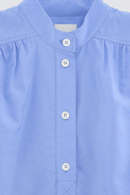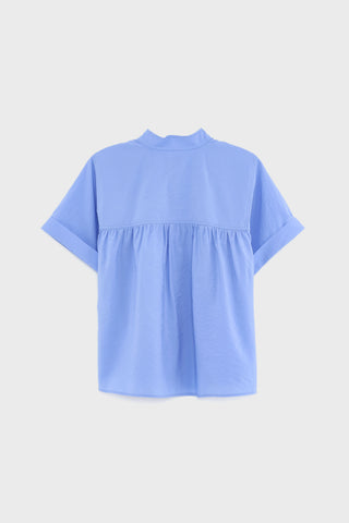 Bloes van het Belgische merk Bellerose. 84% viscose, 16% polyamide. Kleur: Blue Shirt. Bloes ontworpen met een halfopen opstaande kraag, korte mouwen en plooitjes.