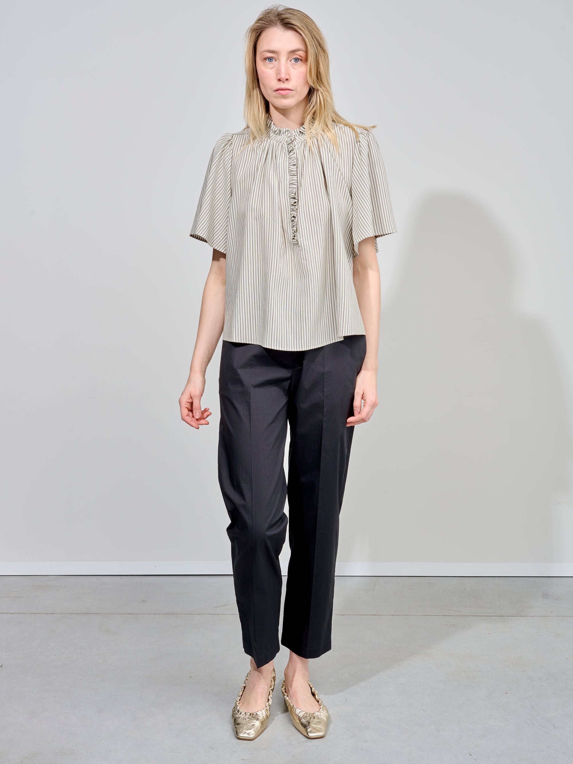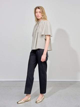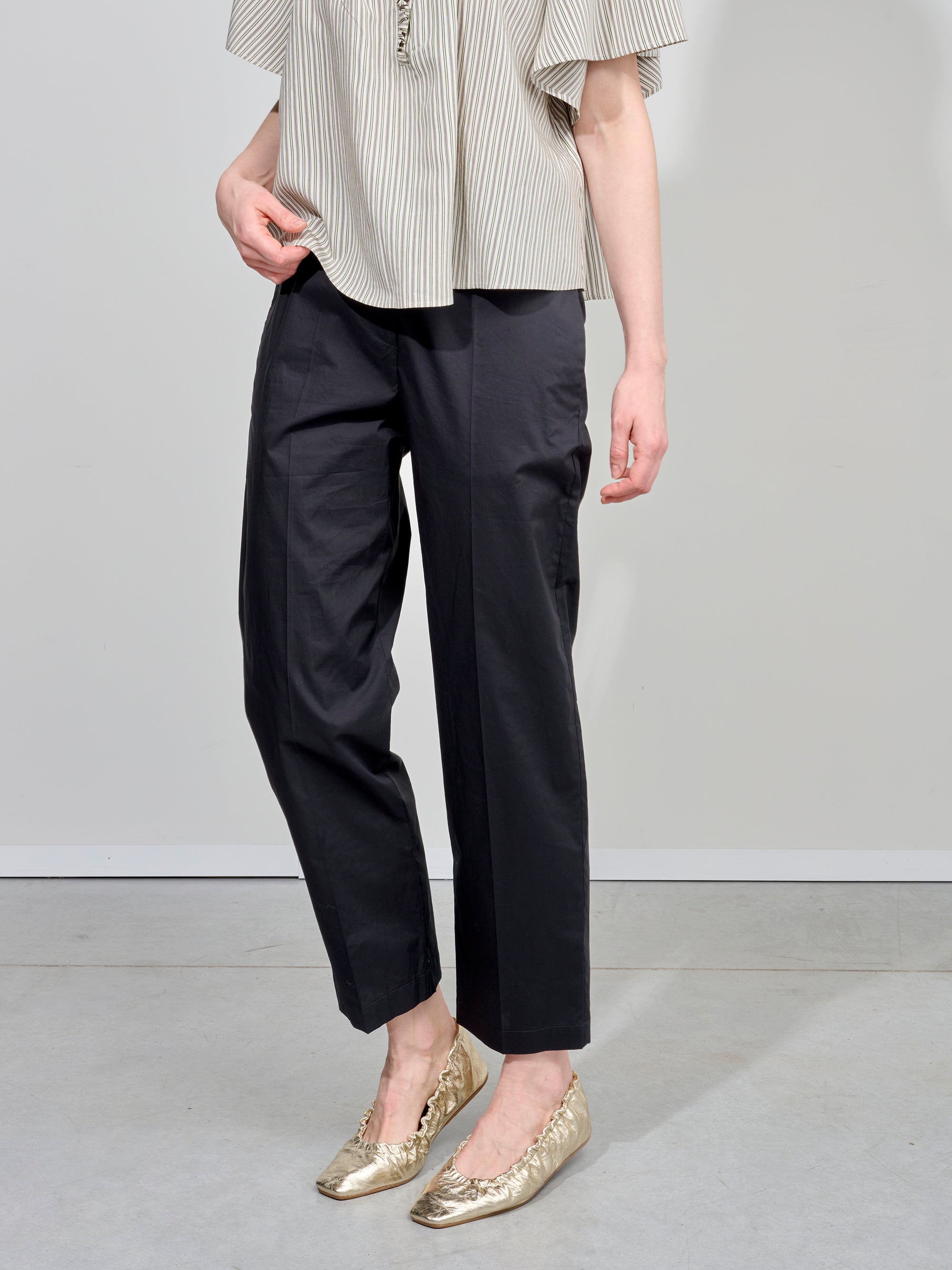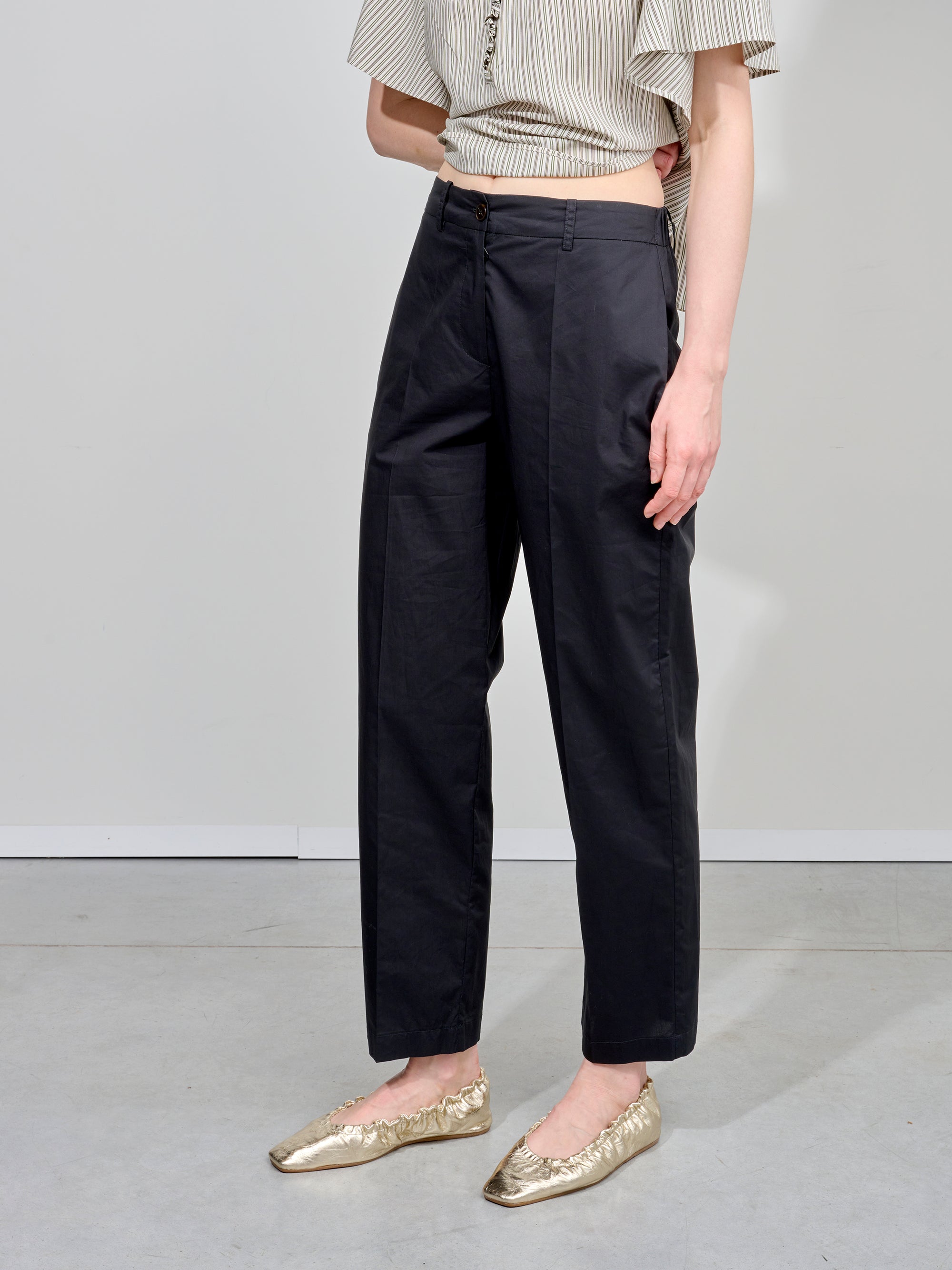 Broek van het Italiaanse merk Alysi. 100% katoen. Kleur: Nero. Rechte pantalon met rekker achteraan.