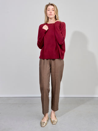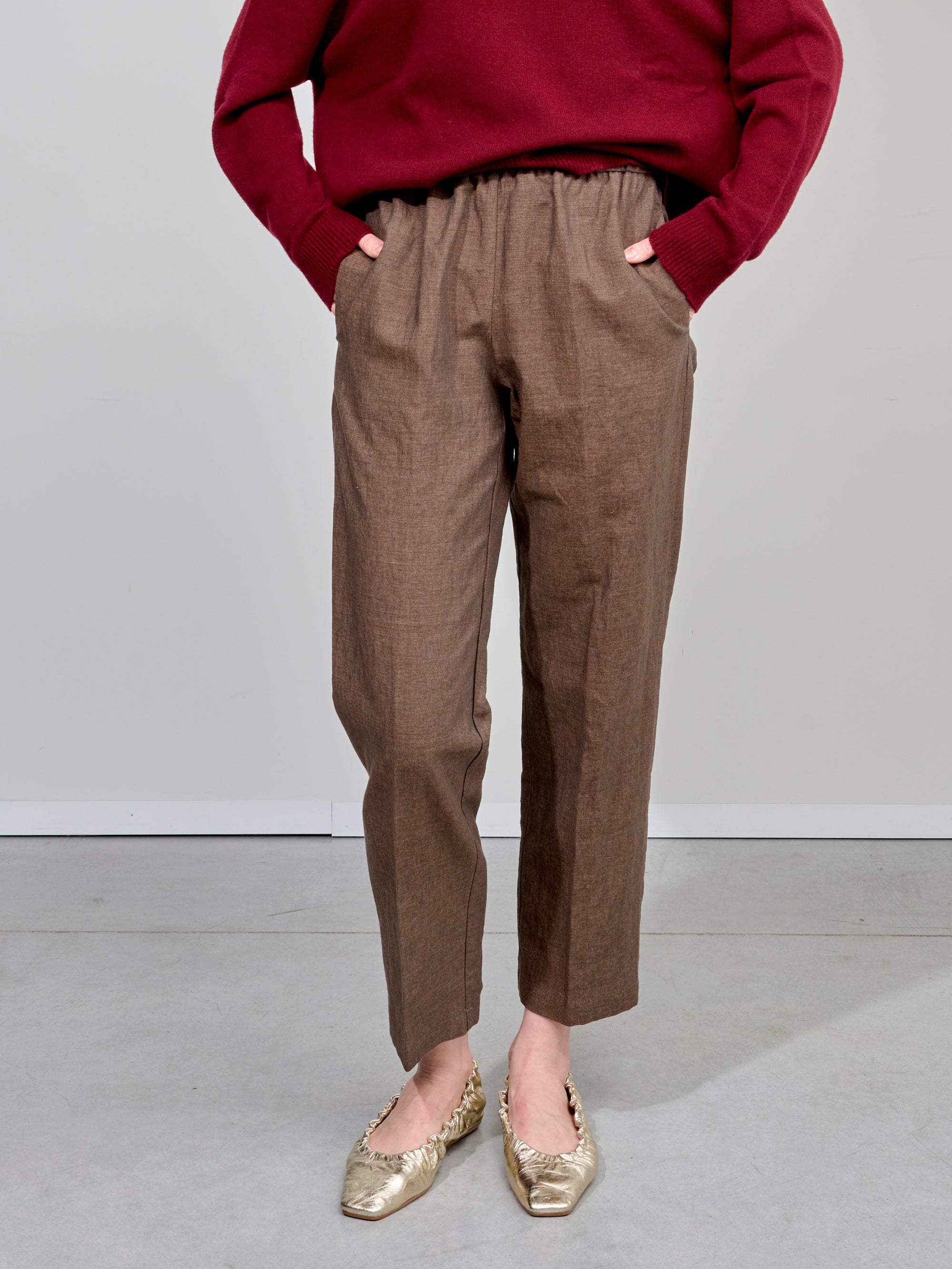 Broek van het Italiaanse merk Pomandère. 54% viscose, 46% linnen. Kleur: 670. Broek met elastische tailleband.