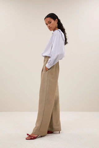 Broek van het Nederlandse merk By-bar. 38% viscose, 36% linen, 26% polyester. Kleur: Gold. glanzende broek heeft een comfortabele, elastische tailleband en een losvallende pasvorm