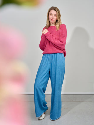 Broek van het Franse merk American Vintage. 100% katoen. Kleur: Medium Blue. Wijde uitlopende broek met elastische tailleband in een soepele denim.