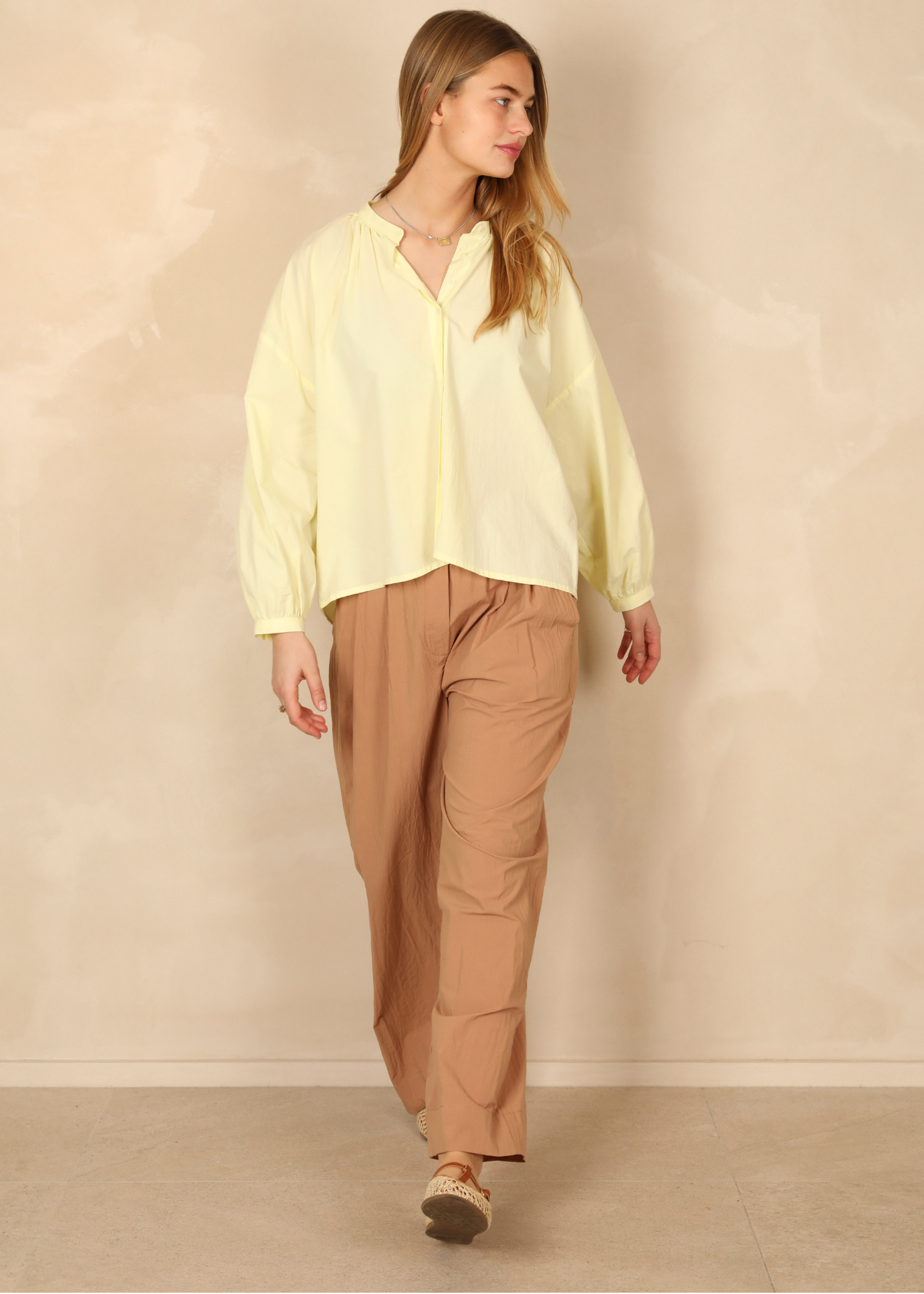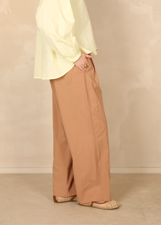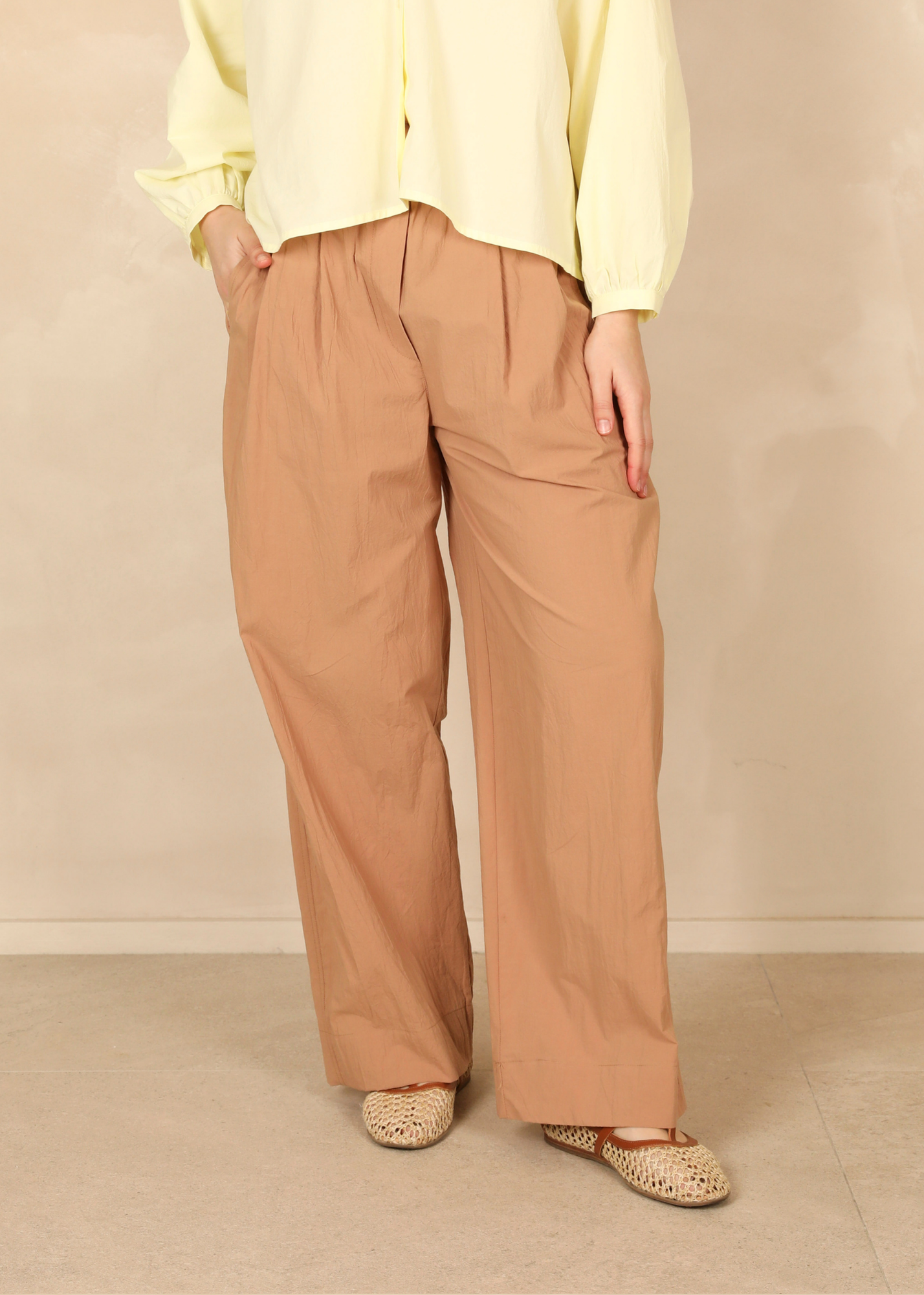 Broek van het Belgische merk Shades. 100% katoen. Kleur: Mokka. Losse broek met elastische tailleband en plooitjes vooraan.