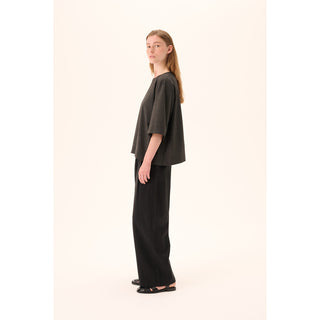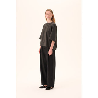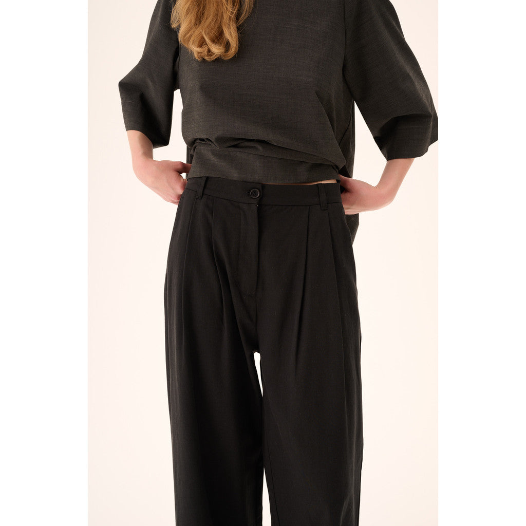 Broek van het Deense merk Rue de Tokyo. 50% tencel, 50% katoen. Kleur: Zwart. Broek met elastische tailleband aan de achterkant voor comfort en plooien aan de voorkant voor een verfijnde look.