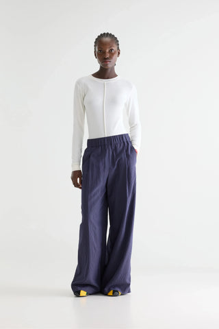 Broek van het Belgische merk Bellerose. 84% viscose, 3% katoen, 13% polyamide. Kleur: Dark Navy/White. Wijde broek met elastische tailleband en paspelzakken, in marineblauw met fijne verticale krijtstrepen.
