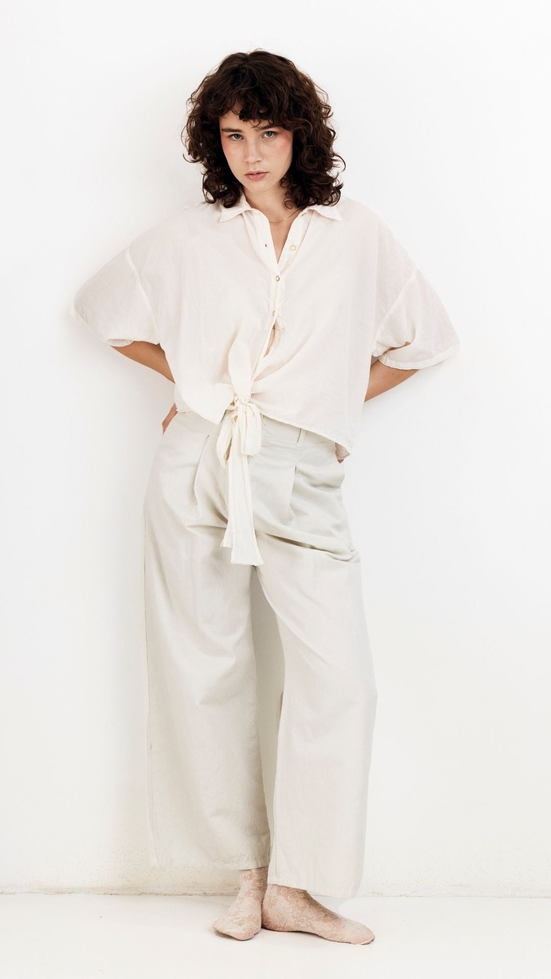 Broek van het Belgische merk Morley. 100% katoen. Kleur: Cloud. Wijde broek in soepele katoen, met plooitjes aan de voorzijde en rekker achteraan.