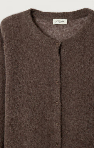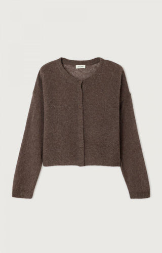 Cardigan van het Franse merk American Vintage. 46% lyocell, 44% wol, 10% kasjmier. Kleur: Egel. Kort cardigan met lange mouwen en ronde kraag met knopen