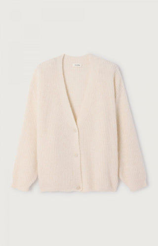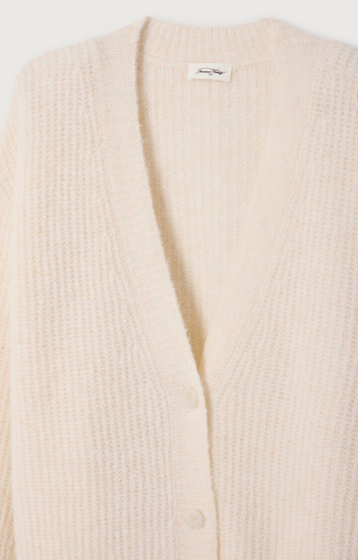 Cardigan van Franse merk American Vintage. 31% alpaca, 35% acrylic, 22% polyamide, 11% wol, % elastaan. Kleur: nacré chiné. Cardigan met lange mouwen en v-hals.