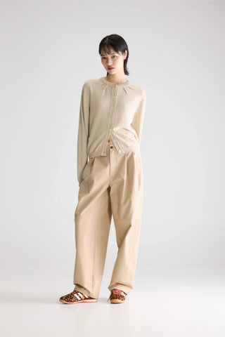 Cardigan van het Belgische merk Bellerose. 40% gerecycled linnen, 30% viscose, 30% polyester. Kleur: Oatmeal. Cardigan met ronde hals en knoopsluiting in een groene linnenmix.