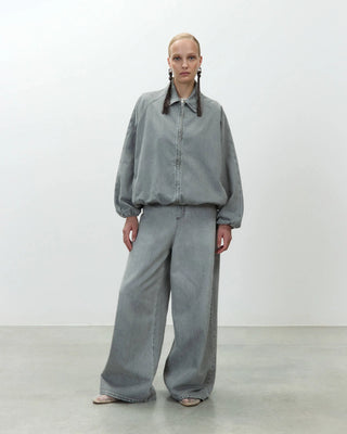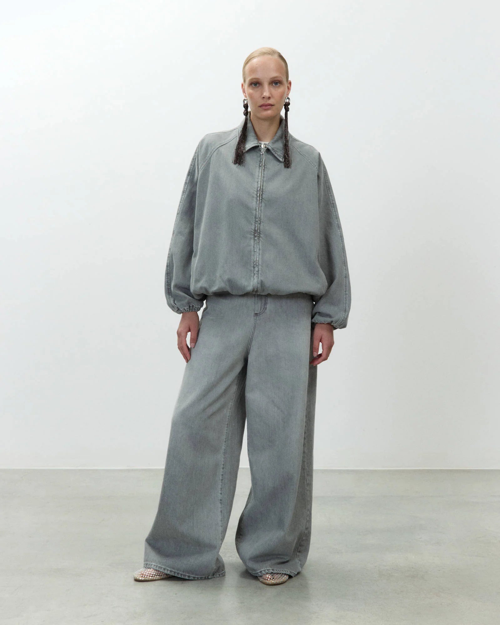 Jas van het Italiaanse merk Alysi. 100% katoen. Kleur: Grijs. Jeansjasje met ritssluiting en rekker op de taille.