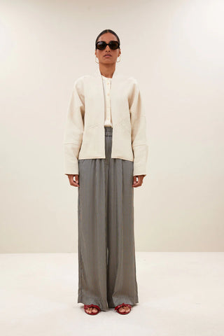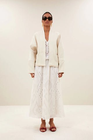 Jas van het Nederlandse merk By-bar. 100% katoen. Kleur: light Chalk. Casual jasje met een relaxte pasvorm. Het jacquardpatroon zorgt voor een subtiele textuur en de praktische zijzakken maken het een ideale keuze voor dagelijks gebruik.